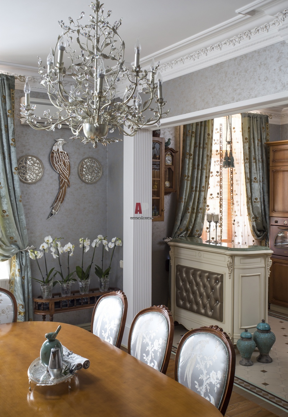 Кухня решена в одном объем со столовой. От обеденной группы ее отделяет барная стойка с фасадом из темного дуба. На стене – панно из зеркал.