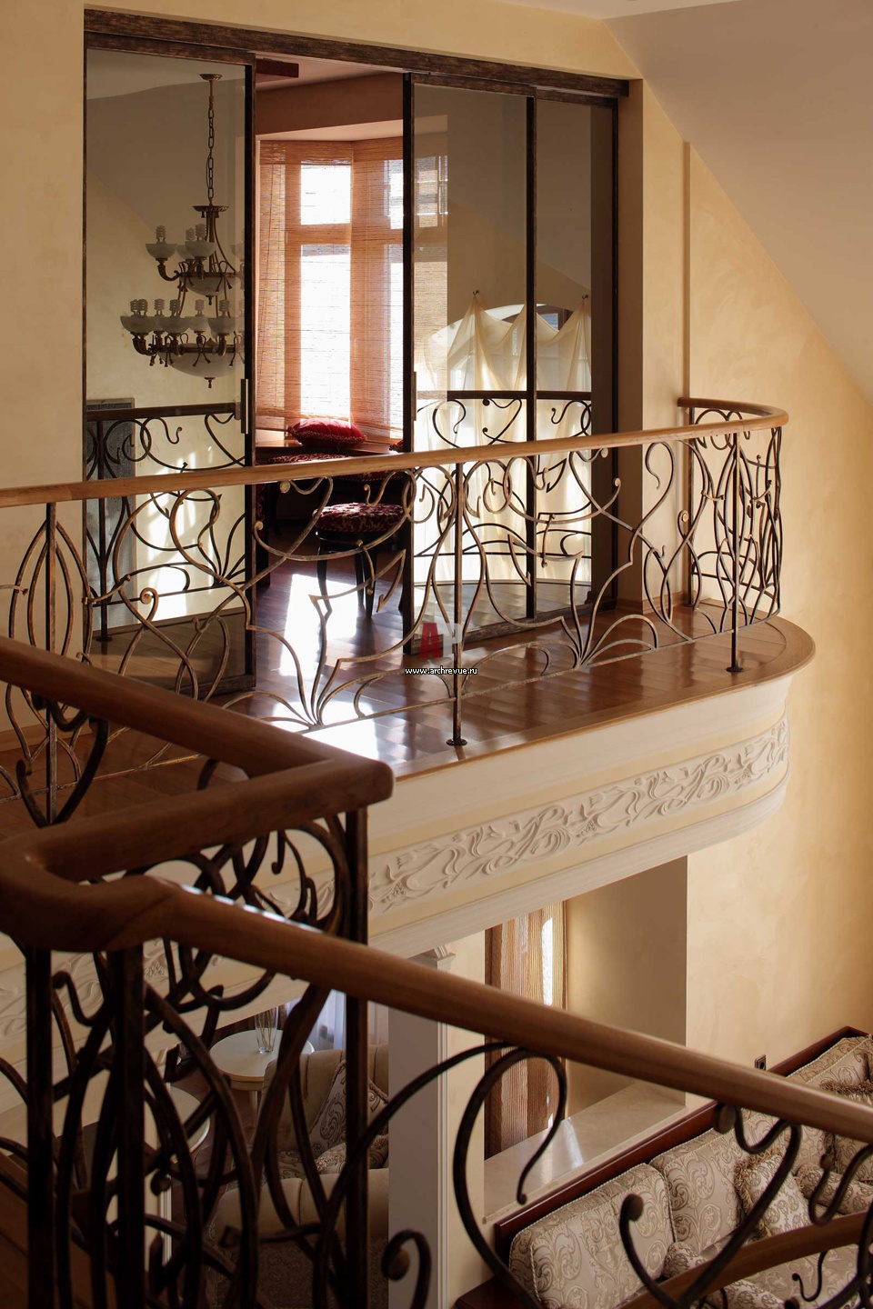 Гипсовая лепнина, поставщик LeDimore, декоративным кантом проходит по несущим конструкциям дома. В комнату отдыха ведет раздвижная дверь из тонированного стекла в деревянном обрамлении, поставщик «Академия Интерьера».