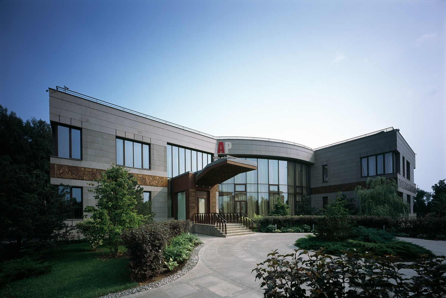 Главный фасад здания с подъездной площадкой для автомашин. Над входной лестницей расположен «карпорт» – длинный козырек, предохраняющий входящего от дождя.