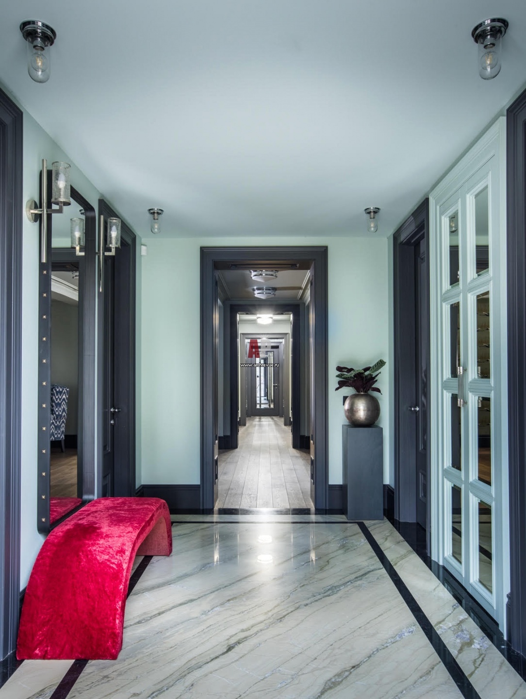 На первом этаже дизайнер сделала парадную анфиладу от входа до окна на противоположном фасаде. Все помещения первого этажа соединены порталами и дверными проемами сложного темно серо-зеленого цвета, практически черного. Вместе с темными плинтусами они придают интерьеру строгость.