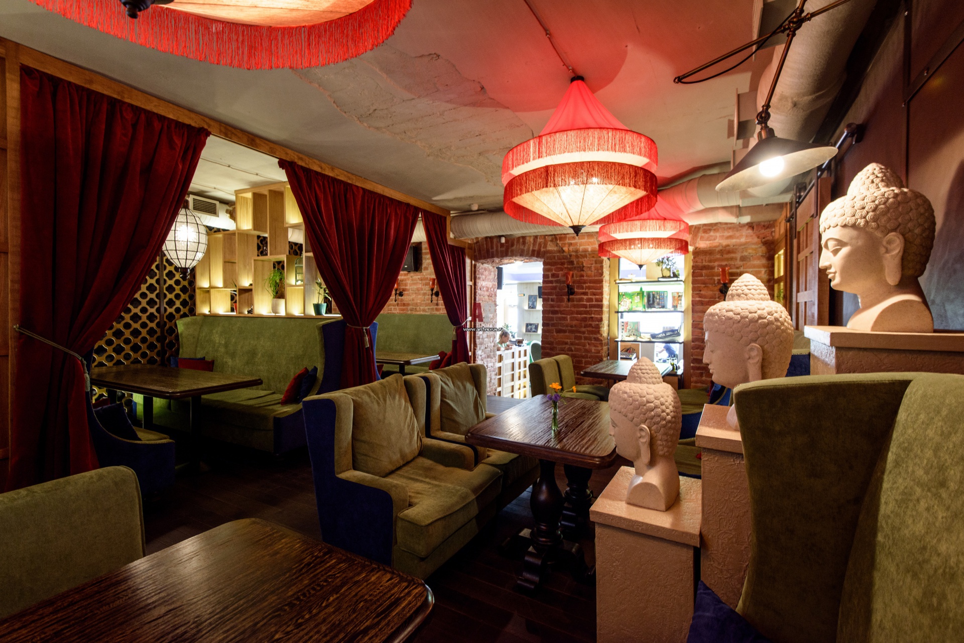 Фото интерьера кальянной в восточном стиле. Атмосфера, располагающая к уединению, подчеркивается тяжелыми плотными шторами, которые при желании можно задернуть, и мягким, приглушенным светом.