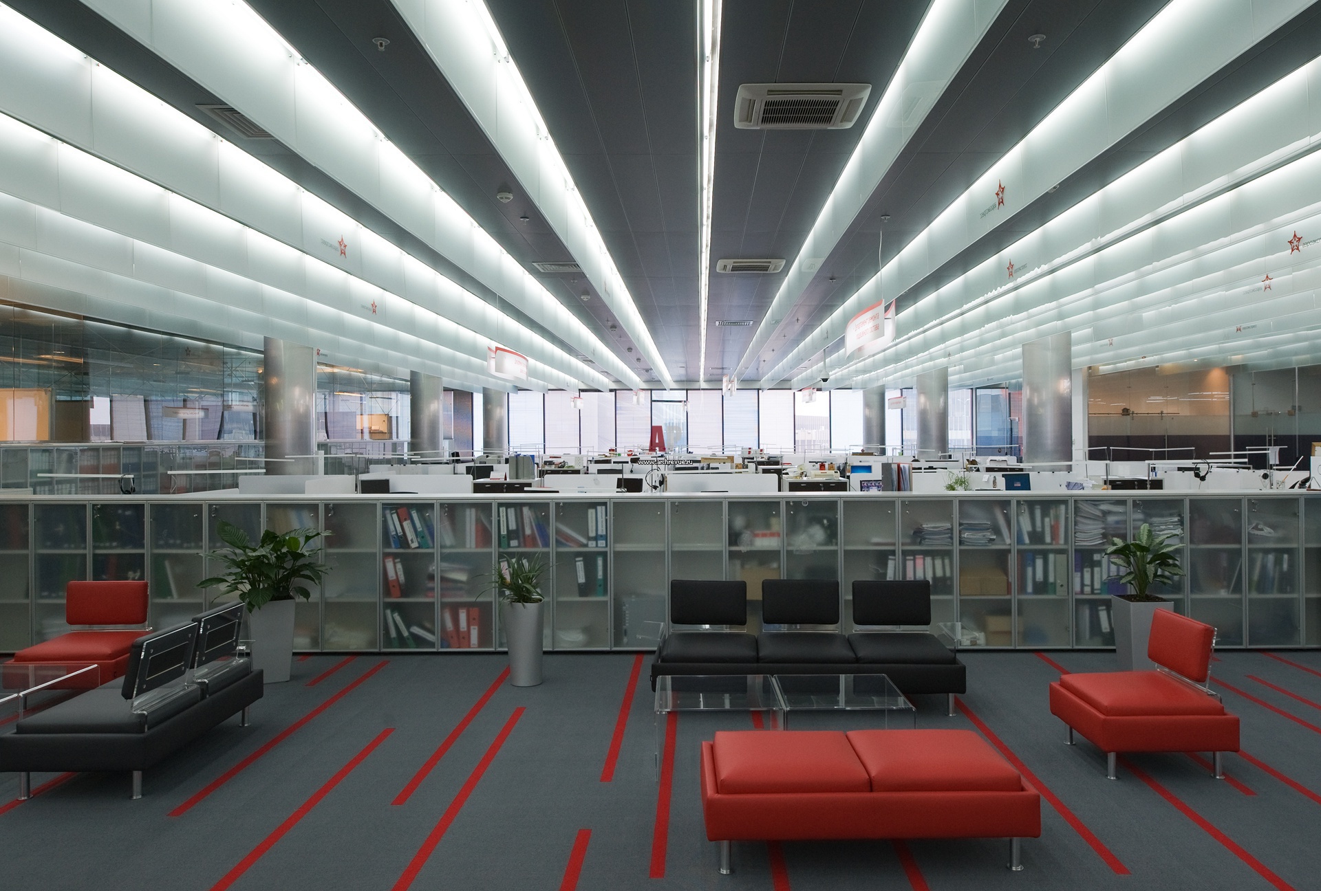 Оперативная мебель решена в фирменных цветах компании – красном и черном.