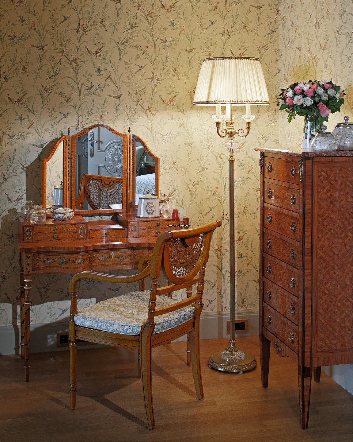Дамский будуар в помещении спальни. Туалетный столик, Restall Brown & Clennell, комод Bevan Funnell, стул Artistic Upholstery. Обои, Thibaut. Все – поставщик Charles.Cameron.