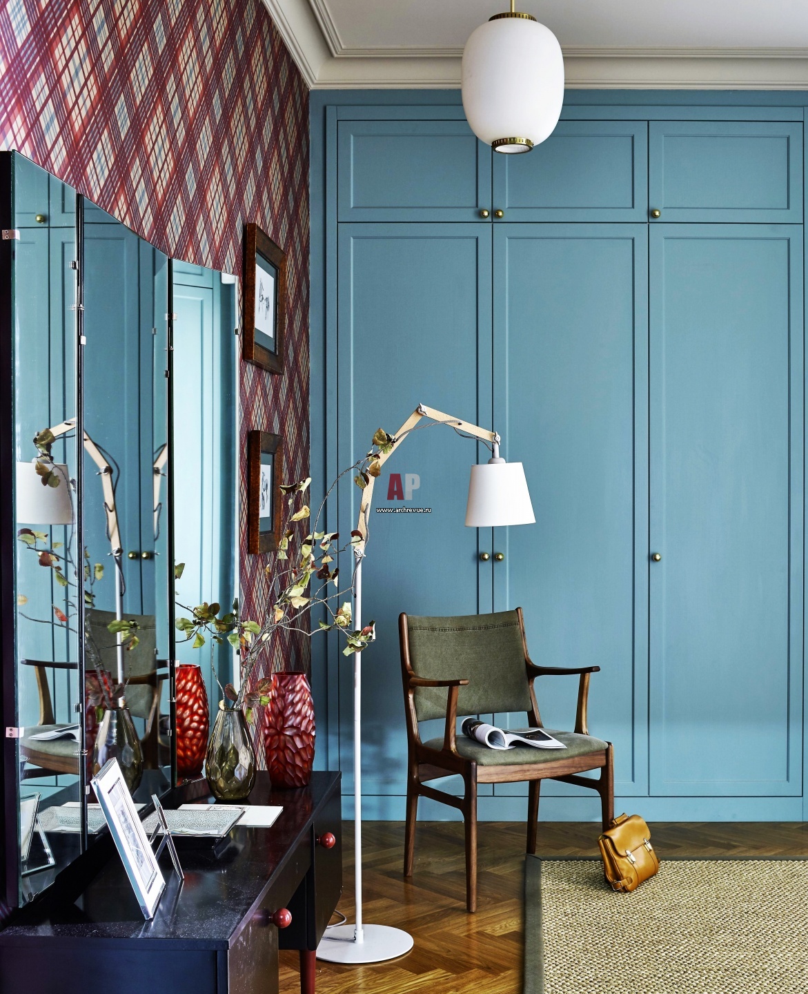 Встроенный шкаф бирюзового цвета в прихожей сделан на заказ по эскизам декоратора Юлии Голавской. Его цвет контрастирует с брусничными обоями, Cole & Son.