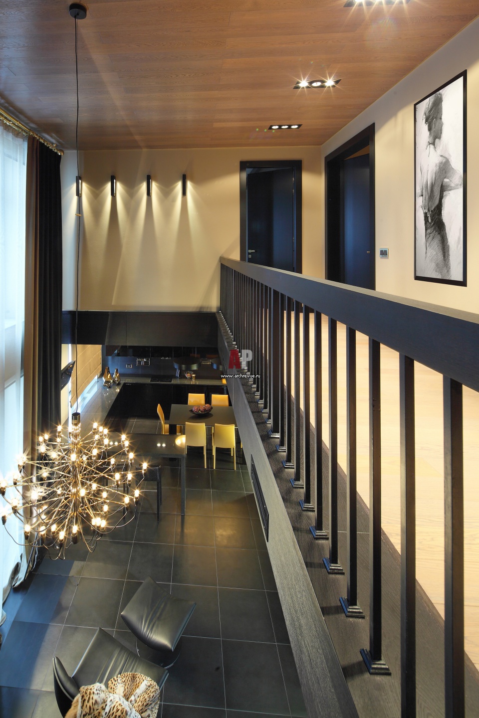 Балкон второго этажа. Потолок двухуровневой гостиной подшит дубовой инженерной доской. На стенах экспонируются работы из коллекции хозяев.