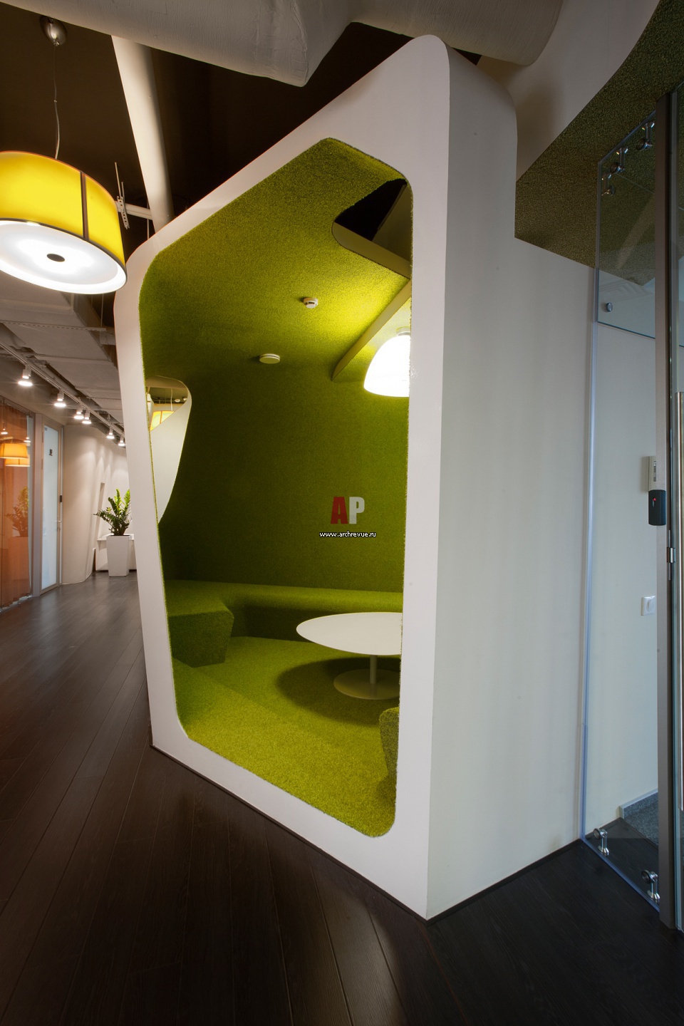 Снаружи «ячейки» белые, под цвет открытых потолочных коммуникаций, а внутри они полностью зашиты ярко-зеленым ковролином. Авторы проекта Петр Зайцев, Арсений Борисенко, архитектурное бюро za bor.