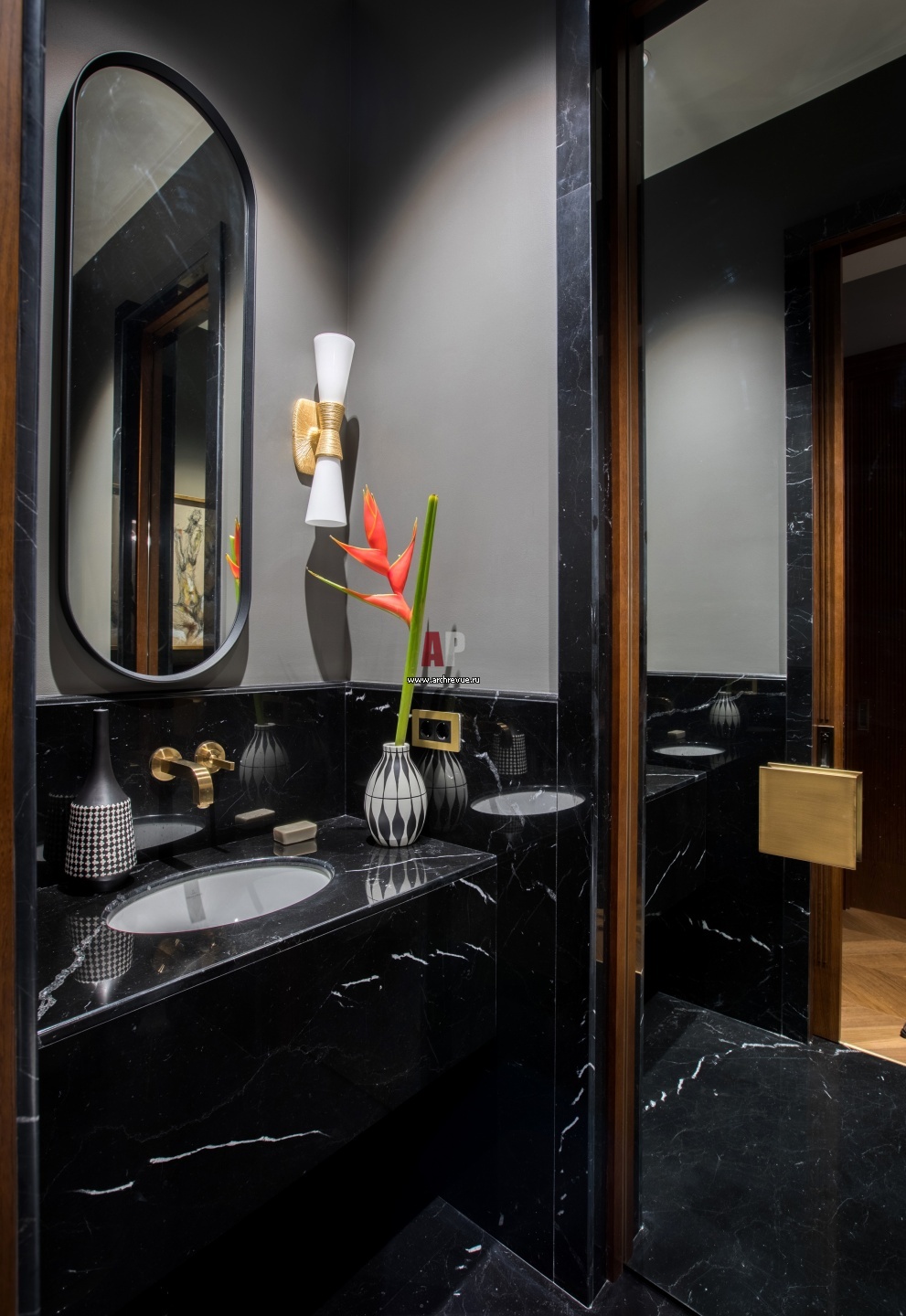 Семейная квартира с экзотическим декором. Низ стен и дверной портал гостевого санузла облицован черным мрамором Nero Marquina. Из этого же камня по эскизам дизайнера выполнена тумба под раковину.