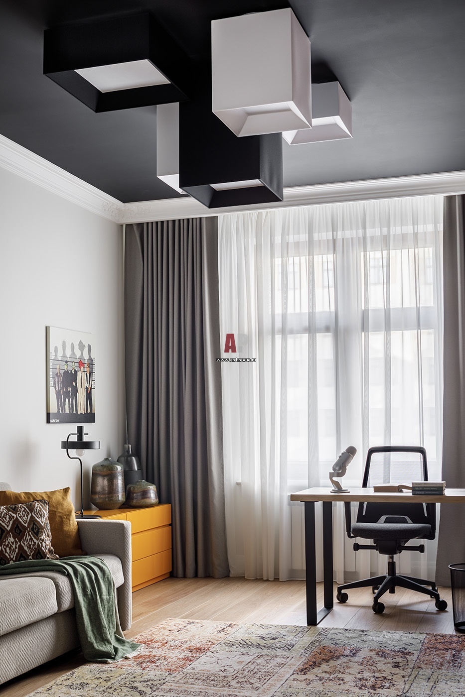 Кабинет оформлен на контрасте белых стен и черного потолка. Пространство масштабирует светильник в виде кубов разного размера, Massmi.