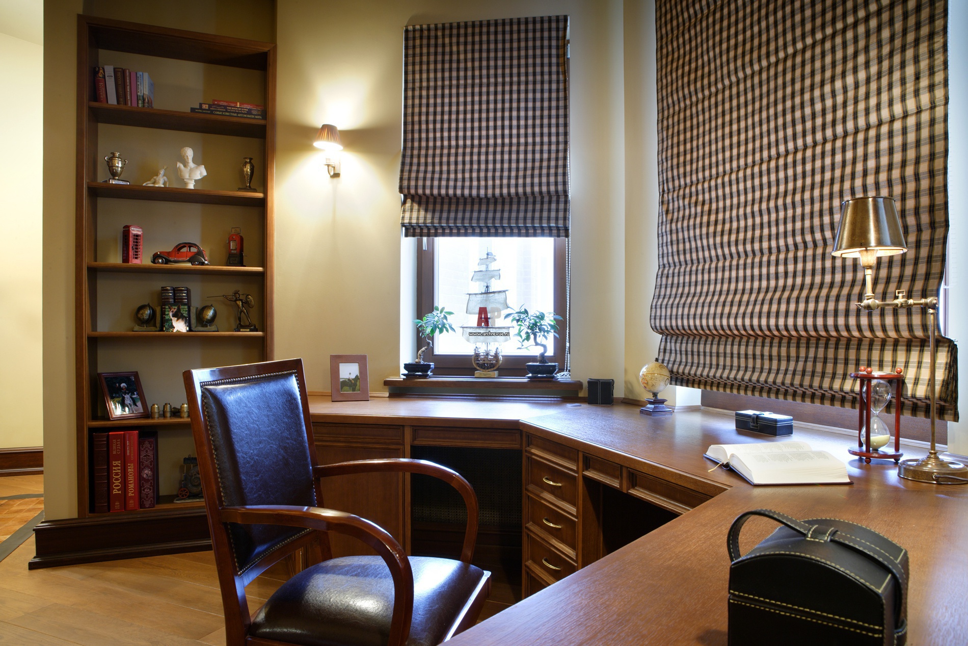 Зона кабинета в детской. Сложной конфигурации стол, повторяющий форму эркера, и стеллажи выполнены на заказ.