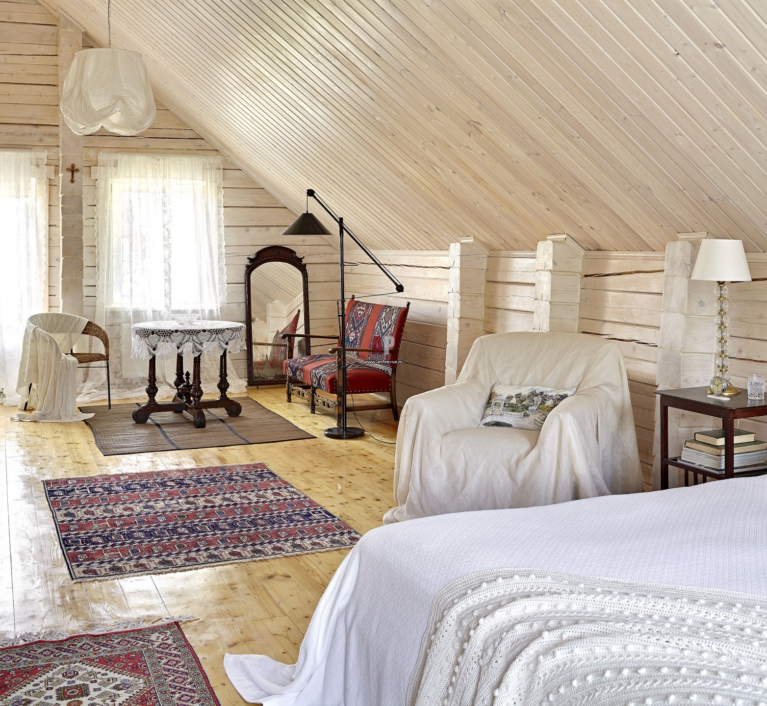 В процессе стройки строители перепутали чертежи и вместо того, чтобы возвести перегородку на втором этаже, сделали ее на первом. Отчего спальня стала просторнее и светлее. Наклонная кровля подшита древесиной лиственницы. Стены и потолок одного цвета, выкрашены лаком для дерева с белым оттеком.