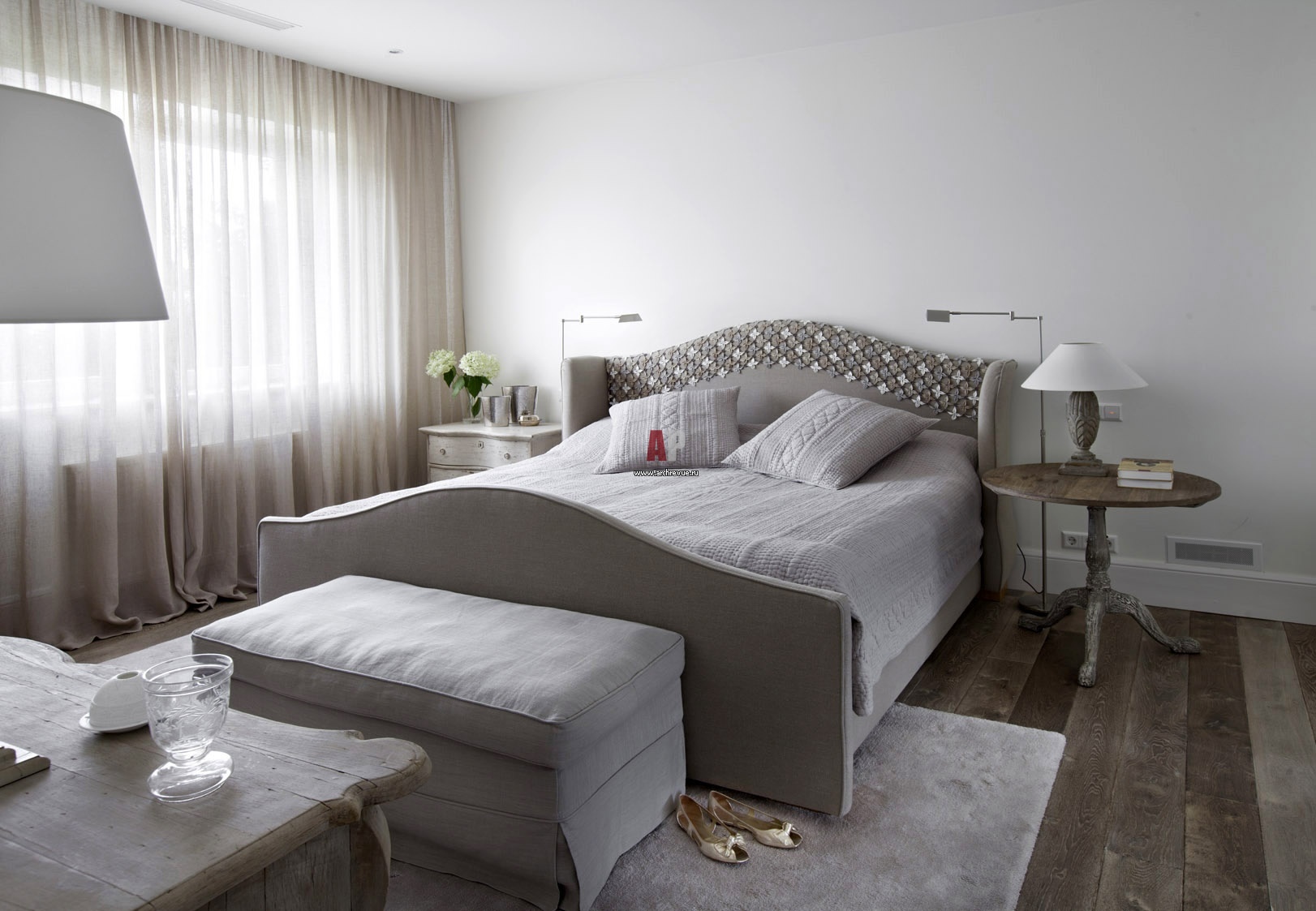 Интерьер дома с северным колоритом. Спальня выдержана в серо-серебристых тонах. Мебель, Flamant, Dantone Home.