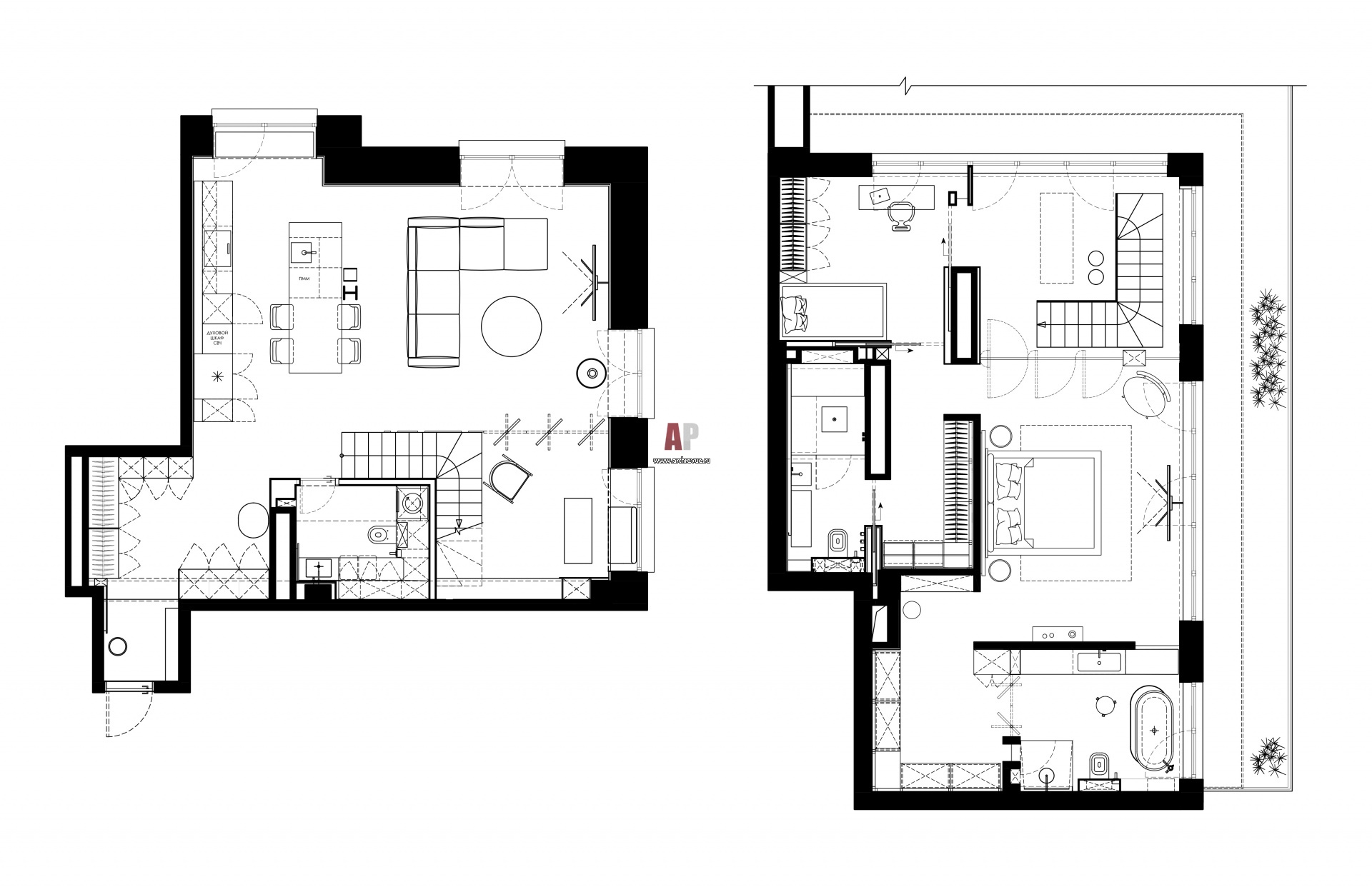 План 1 и 2 этажа 2-х уровневой квартиры в здании бывшей фабрики «Большевик».