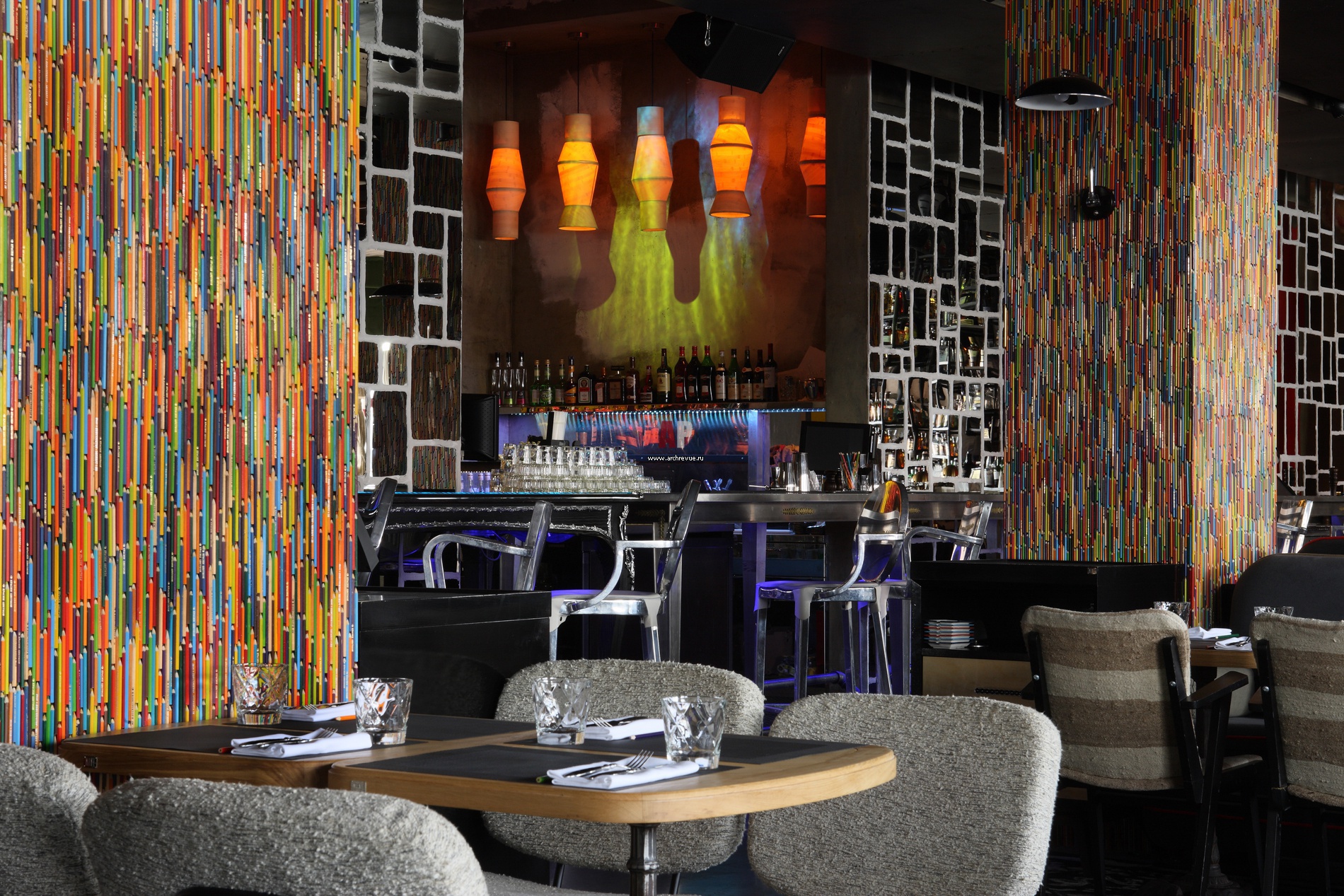 Фото интерьер зала трендового ресторана. Колонны декорированы цветными карандашами, которых «пошло» несколько тысяч.