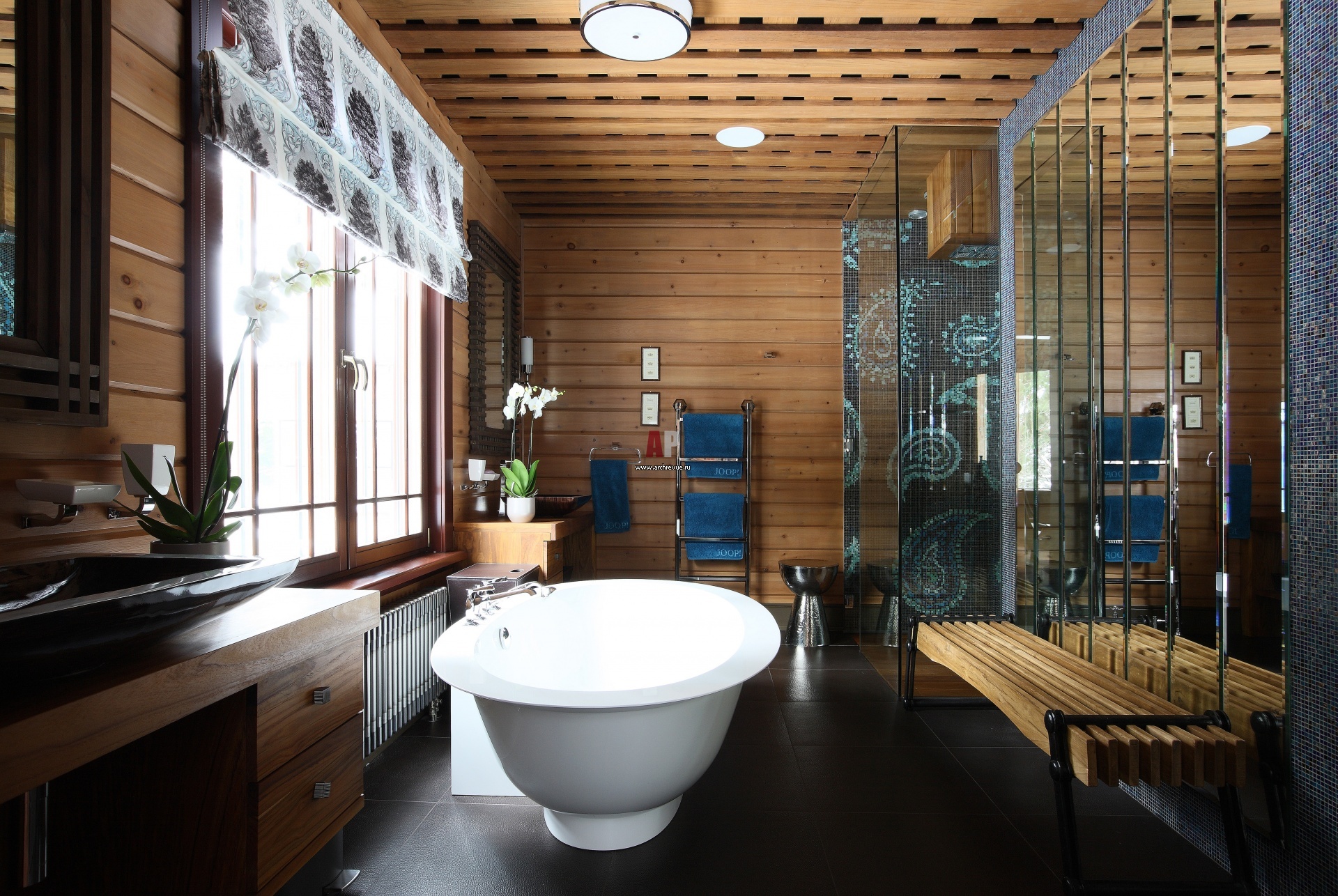 Ванная комната при хозяйской спальне. Мебель сделана на заказ из тика. Душевая кабина отделанная мозаикой Bisazza с рисунком «турецкий огурец».