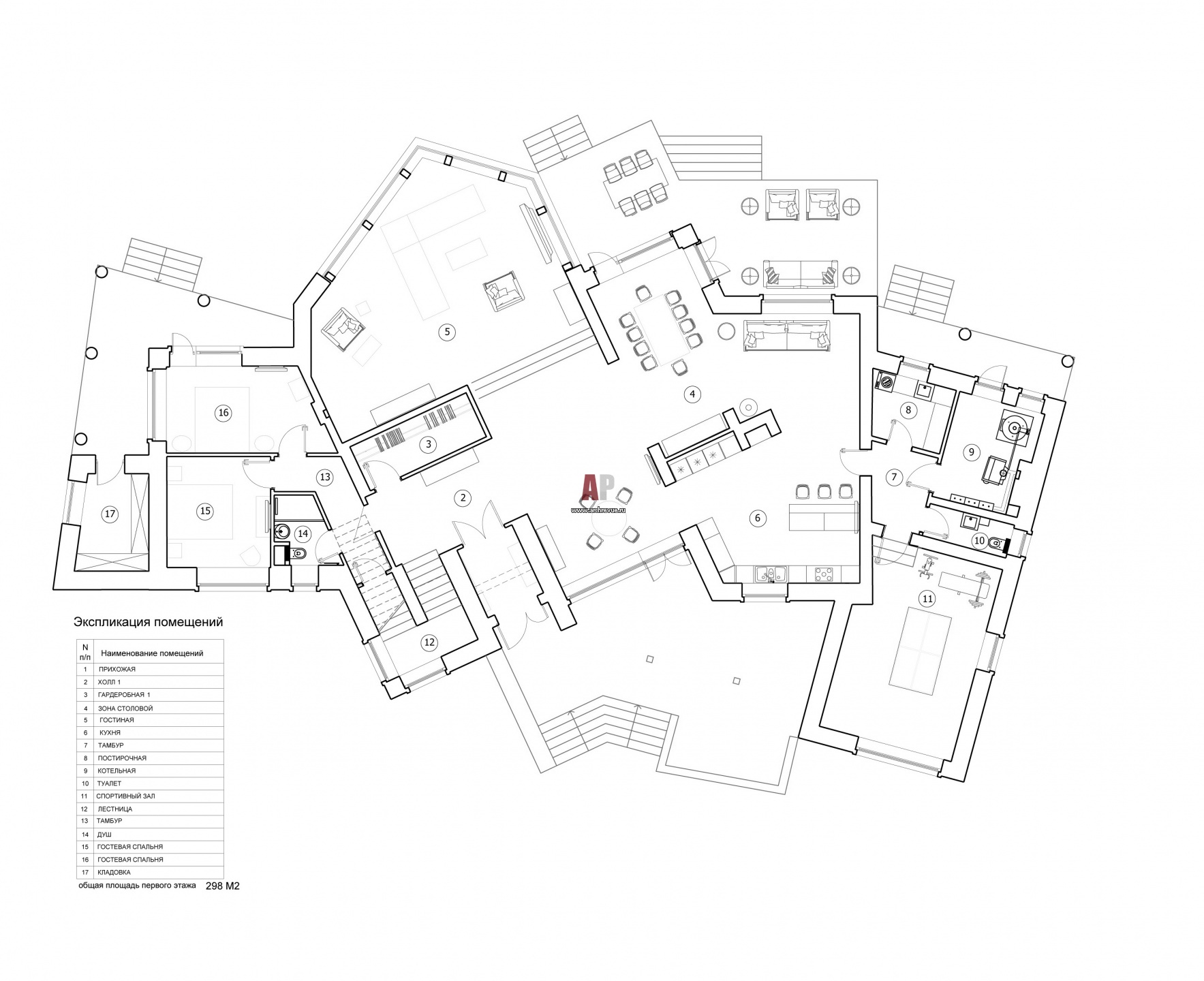 План первого этажа площадью 450 кв. м с расстановкой мебели.