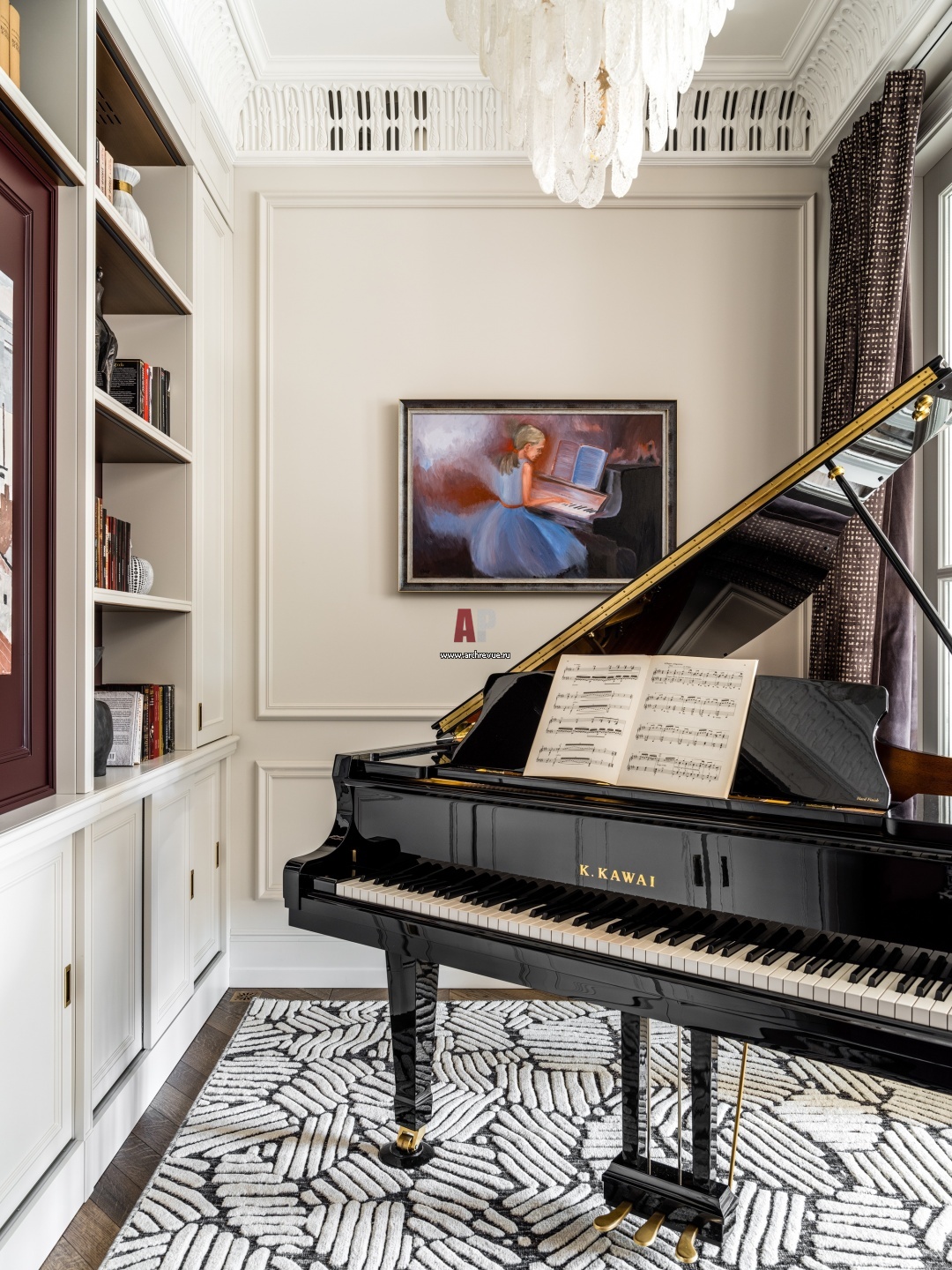 Библиотека с роялем. Шкафы сделаны на заказ.