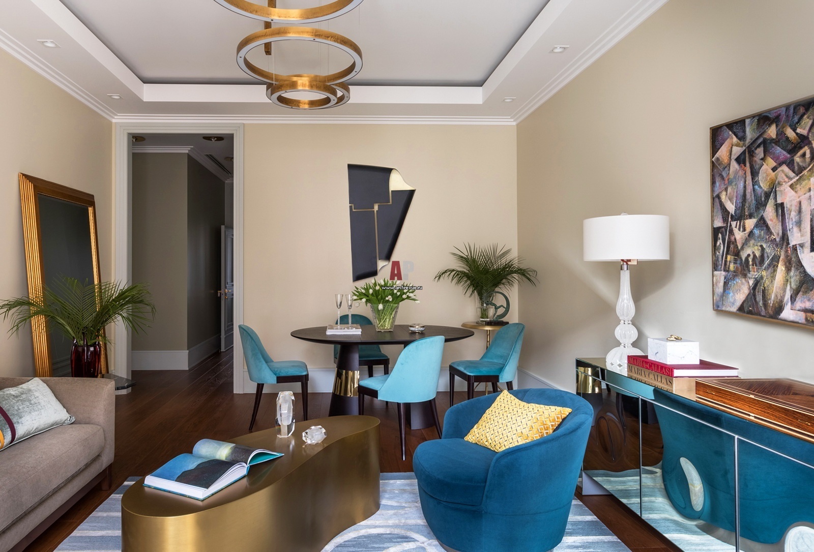Зона столовой в гостиной. Стулья, LCI Stile. Обеденный стол из темного дерева с латунной вставкой сделан на заказ, по эскизам дизайнера.