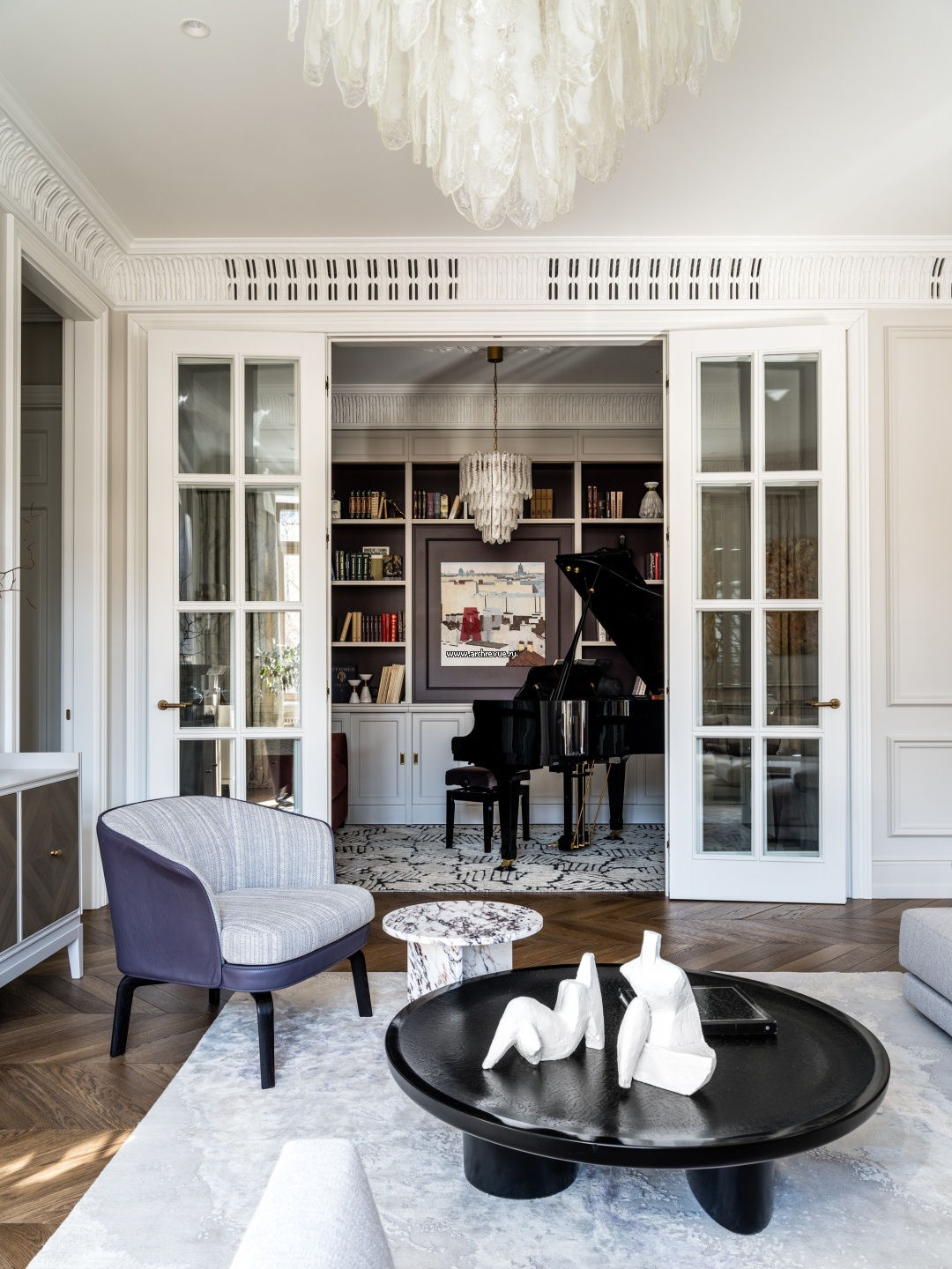 Библиотека с функцией музыкальной комнаты. На рояле регулярно музицирует дочь заказчиков – лауреат многочисленных премий. Люстра, Venini.