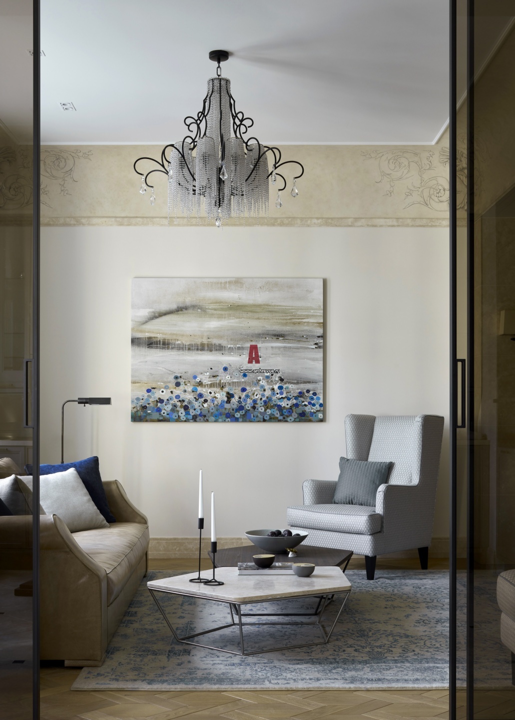 Квартира с мотивами классических итальянских интерьеров в Москве. Зона отдыха в гостиной. Кресло, Cava в обивке тканью Colefax & Fowler. Журнальные столики, Natuzzi. Картина аргентинской художницы Беттины Левин (Betina Lewin) сделана на заказ специально для этой квартиры.