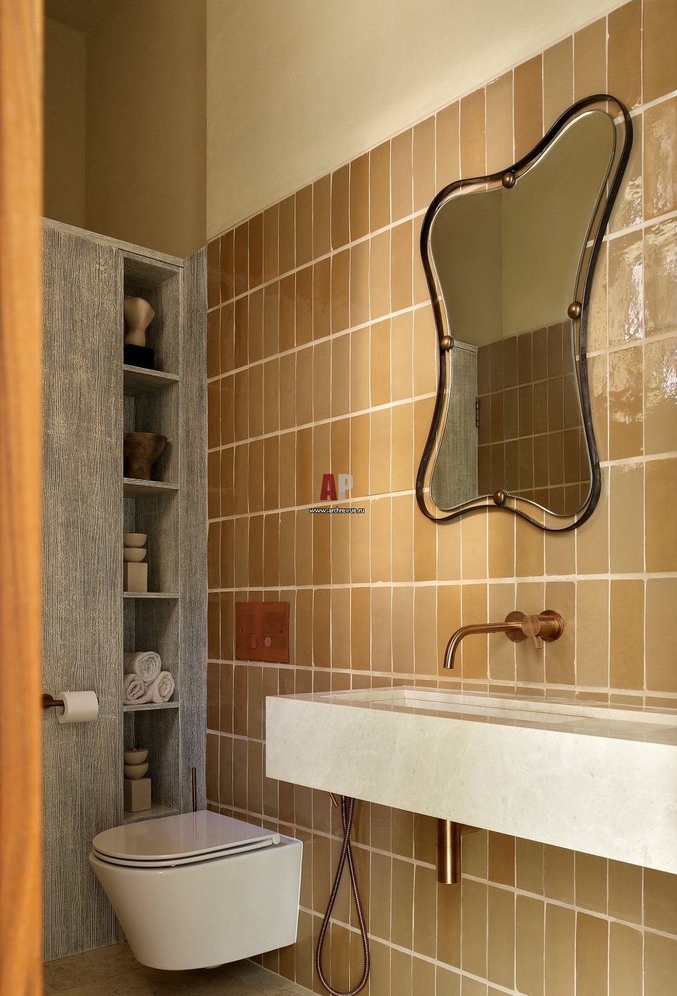 Гостевой санузел на первом этаже. Плитка на стенах, ручная керамика, Zellige. Шкаф, на заказ – изготовление Bionica Wood.