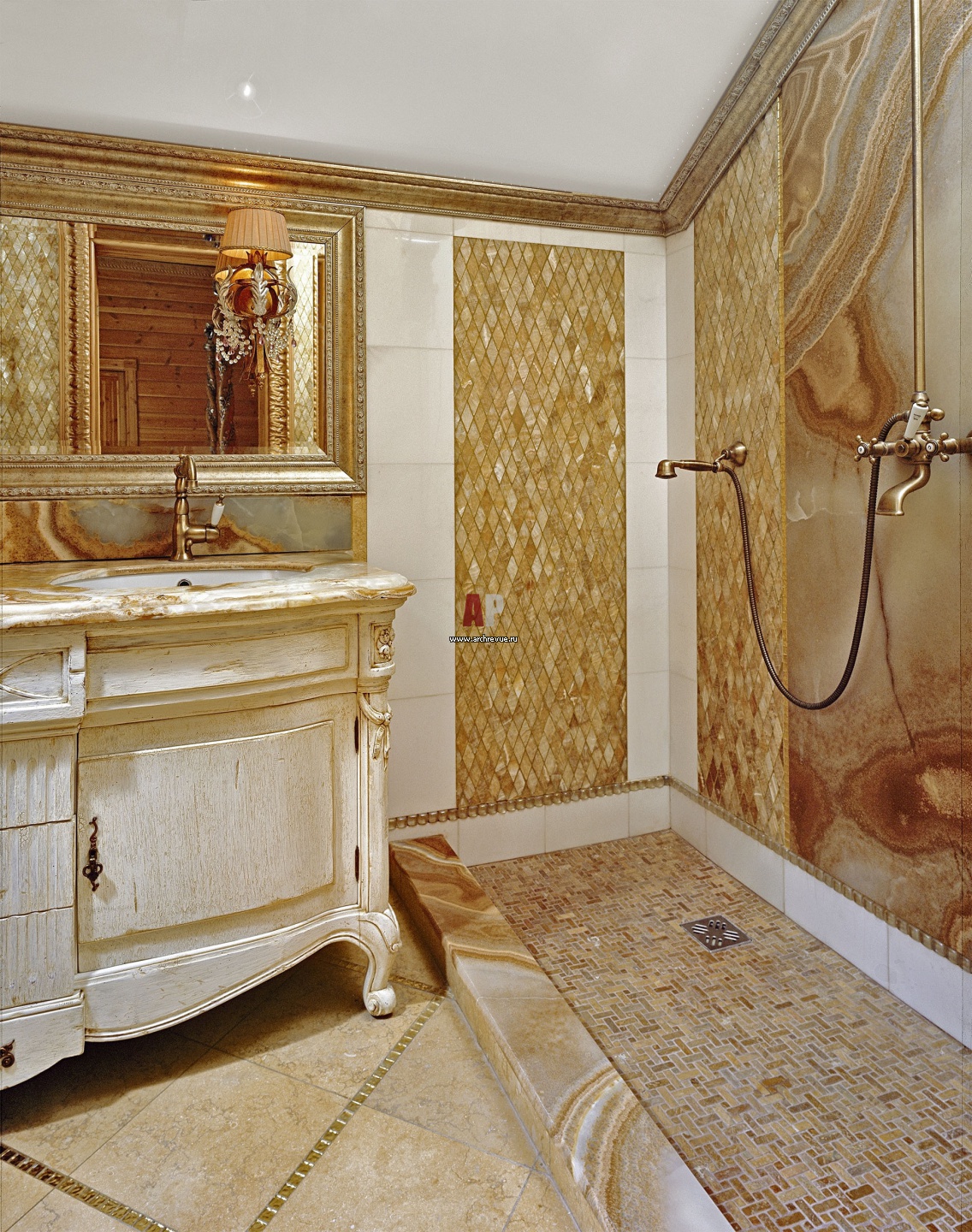 Интерьер ванной комнаты оформлен ониксом и мраморной мозаикой. Сантехника, Villeroy & Boch.