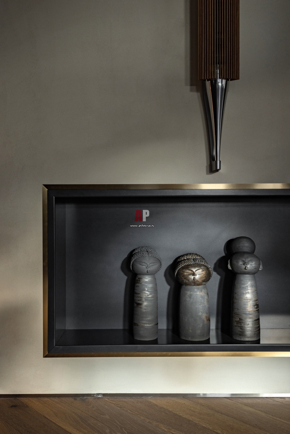 Камин отделен черным листовым металлом, окантовка выполнена из латуни.
