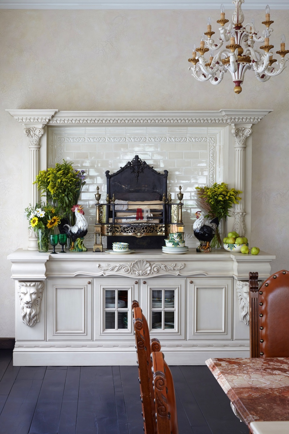 Яркая деталь кухни – белый буфет с чугунной антикварной дровницей.
