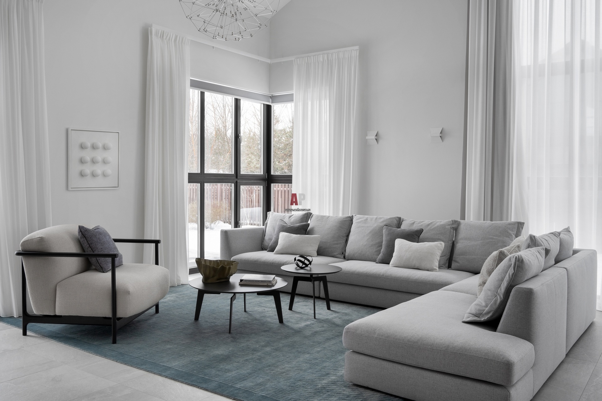 Белые стены – одно из главных пожеланий заказчика. Интерьер дома построен на сочетании белого, светло-серого, черного цветов и теплых оттенков дерева. Краска для стен и потолков, Oikos.