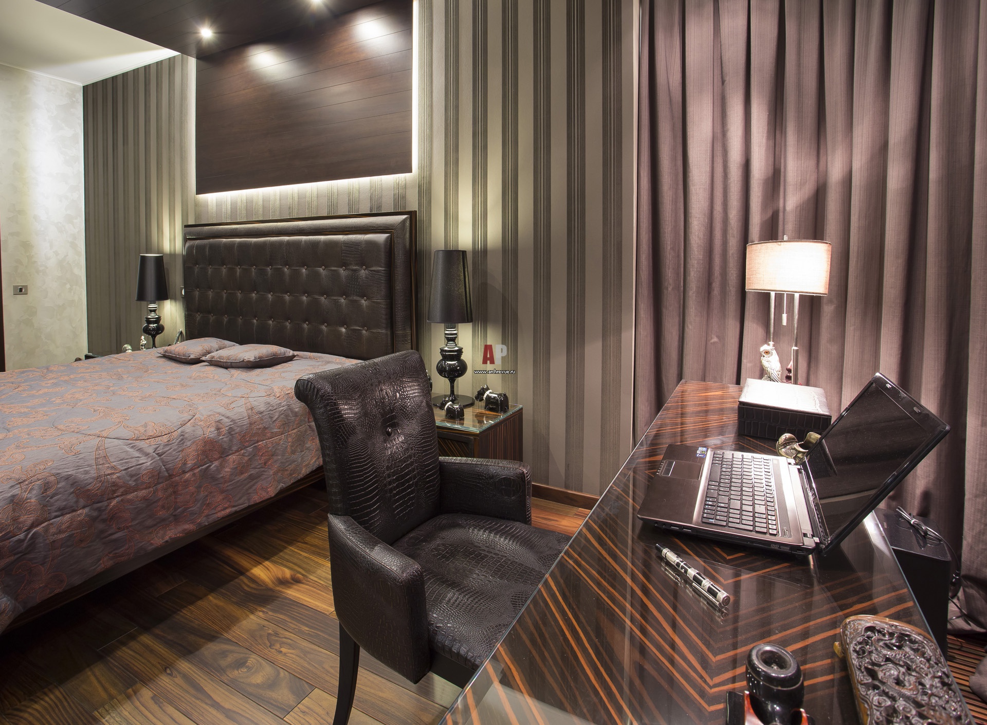 Фото интерьера мужской спальни в стиле ар-деко. Колористика помещения выдержана в шоколадно-фисташковых тонах. Мебель Smania из экзотического дерева с кожей. Массивная доска из ореха, поставщик Villa di Parchetti.