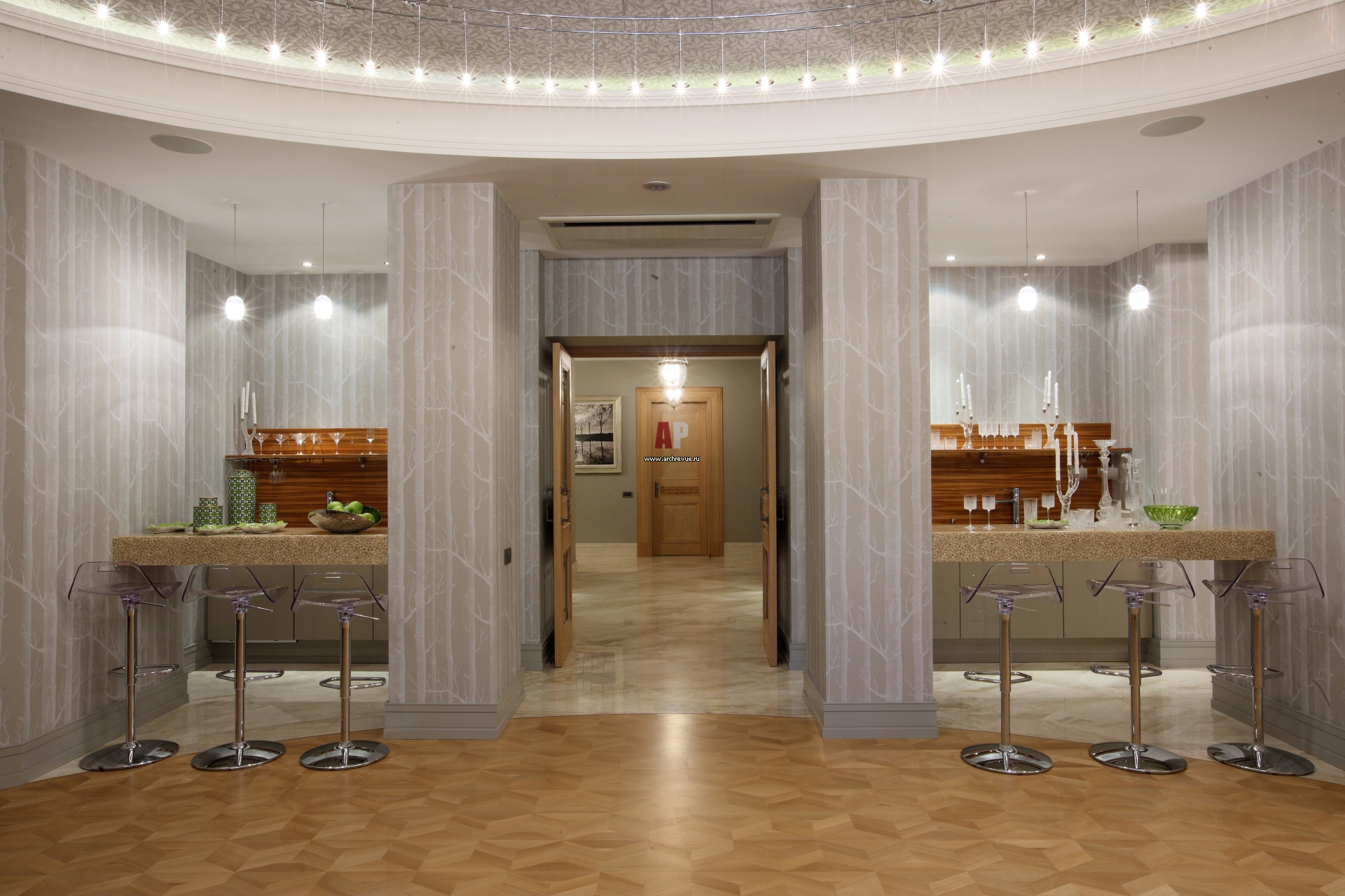 Барная зона с винотекой расположена на нижнем уровне рядом с другими помещениями развлекательного назначения. Две барные стойки расположены симметрично относительно центрального прохода. Интерьер выполнен в эко-стилистике.