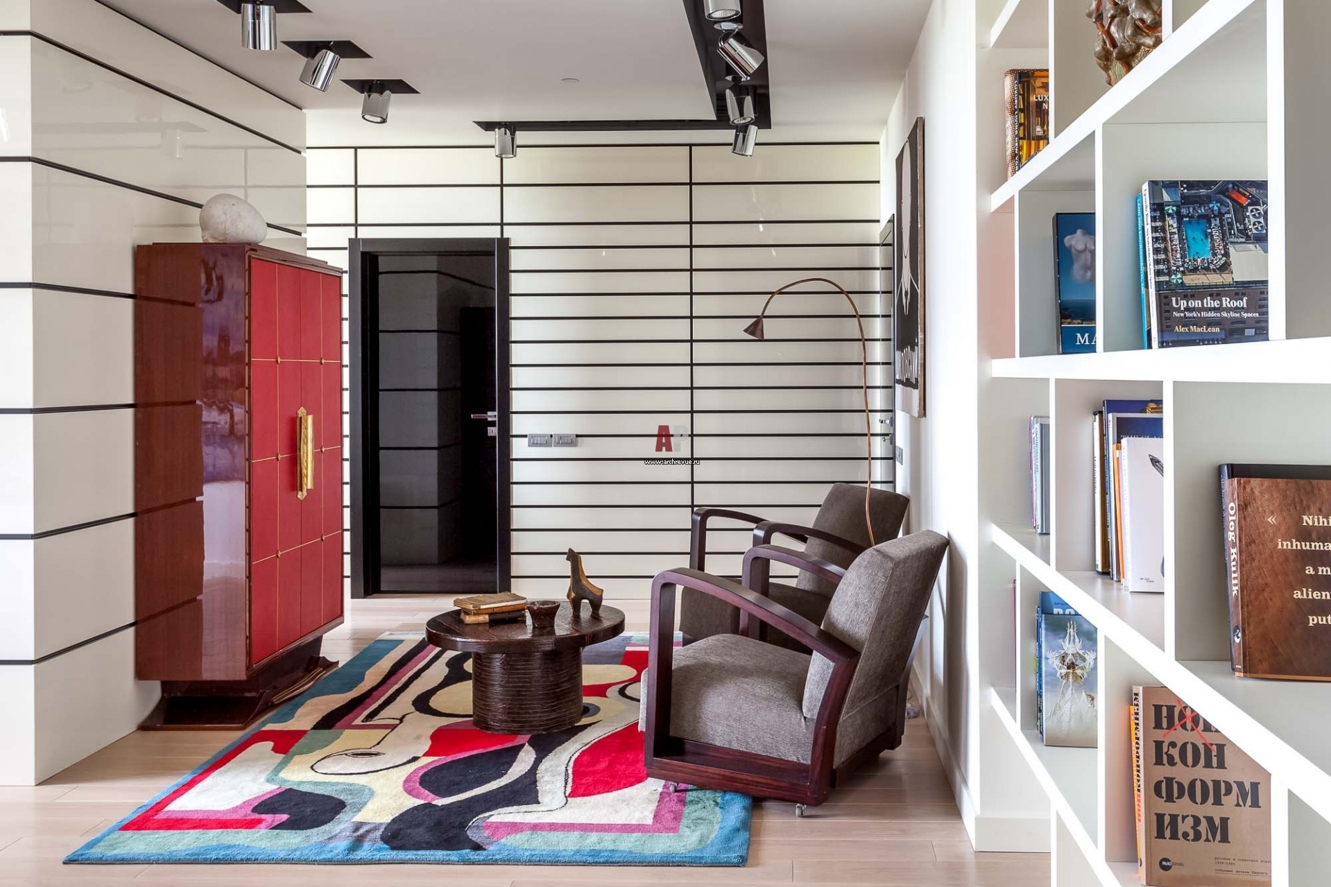 Интерьер камерной гостиной с зоной отдыха и библиотекой. Стены облицованы лаковыми панелями с черной окантовкой, имитирующими клавиши рояля. Два кресла и круглый столик, Giorgetti. Красный шкаф, антиквариат. Дизайнерский ковер выполнен по эскизу Огюста Эрбена.