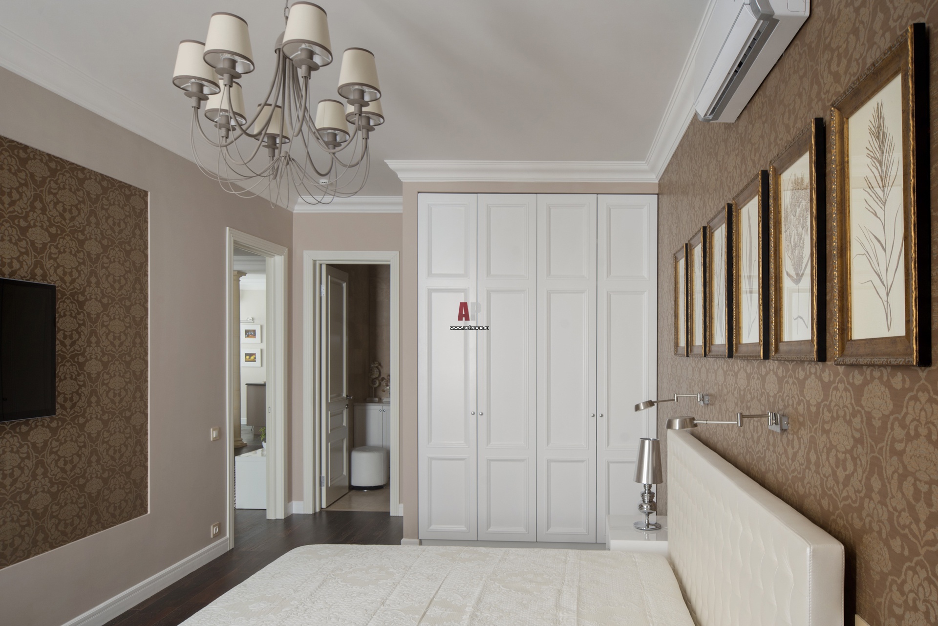 Вид из спальни на ванную комнату. Встроенный шкаф цвета слоновой кости сделан на заказ. Бра, настольные лампы с хромированным основанием.