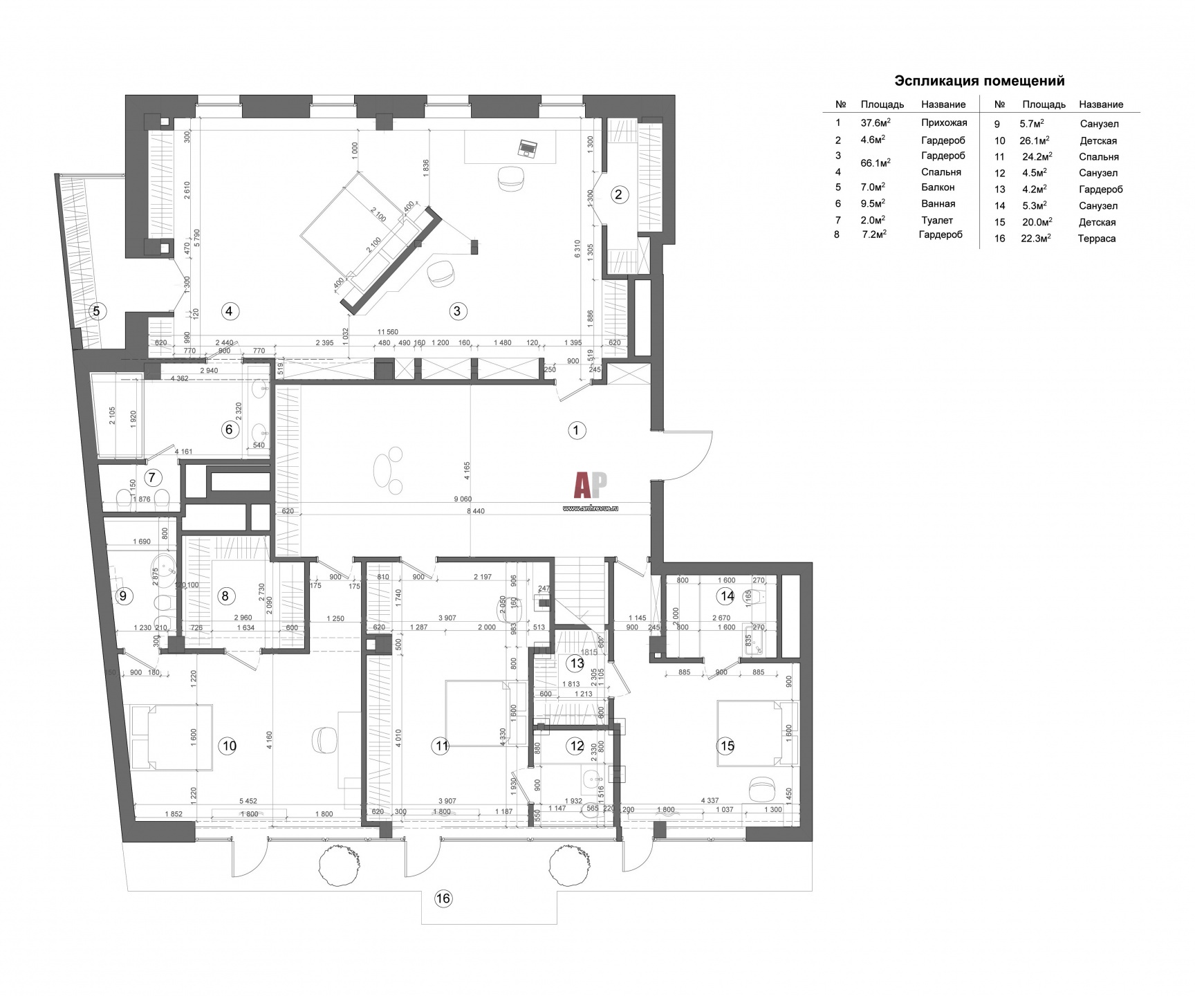 Планировка 1 этажа 2-х этажного пентхауса с открытой террасой в центре Москвы.