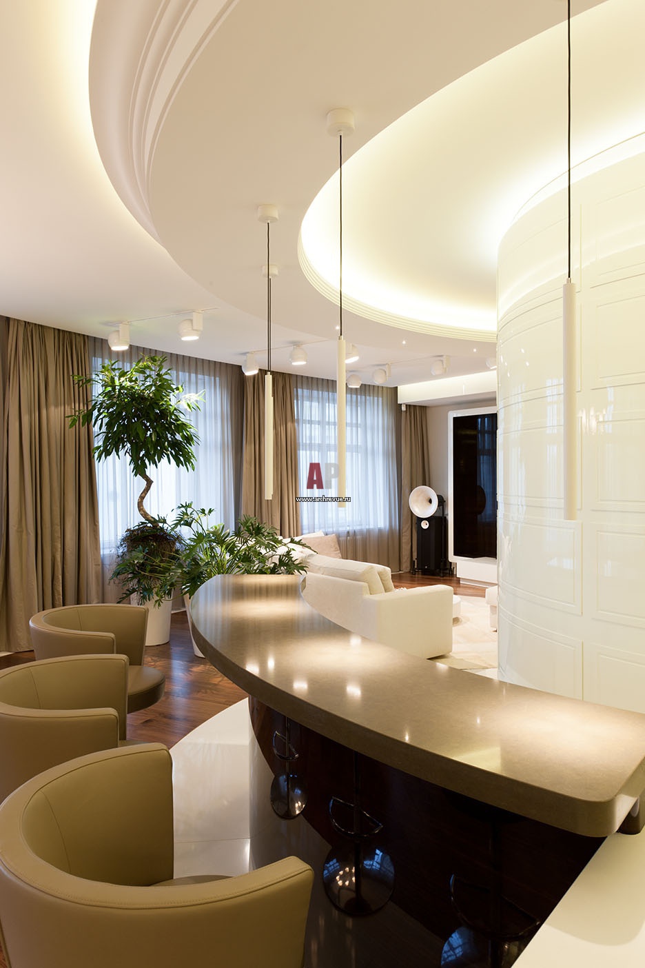 Кухню огибает полукруглая барная стойка. Барная зона с кожаными креслами. Вертикальные белые светильники на металлических тросах, Xal.