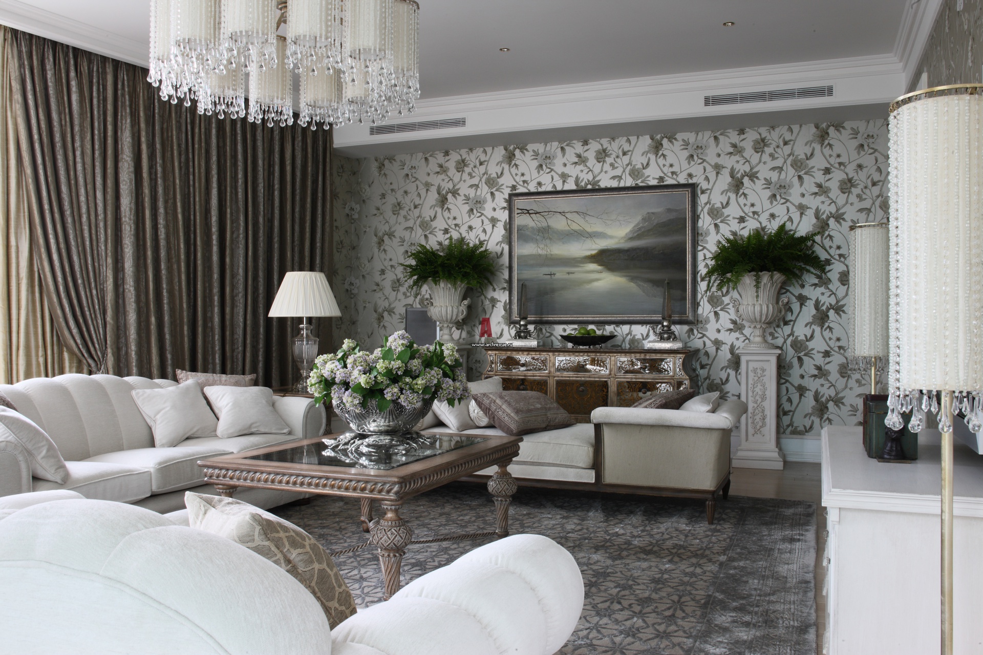 Интерьер гостиной в серебристо-жемчужных тонах. Большинство стен оформлено фактурной штукатуркой с перламутровым финишем. Центральная часть выделена обоями от Zoffany.