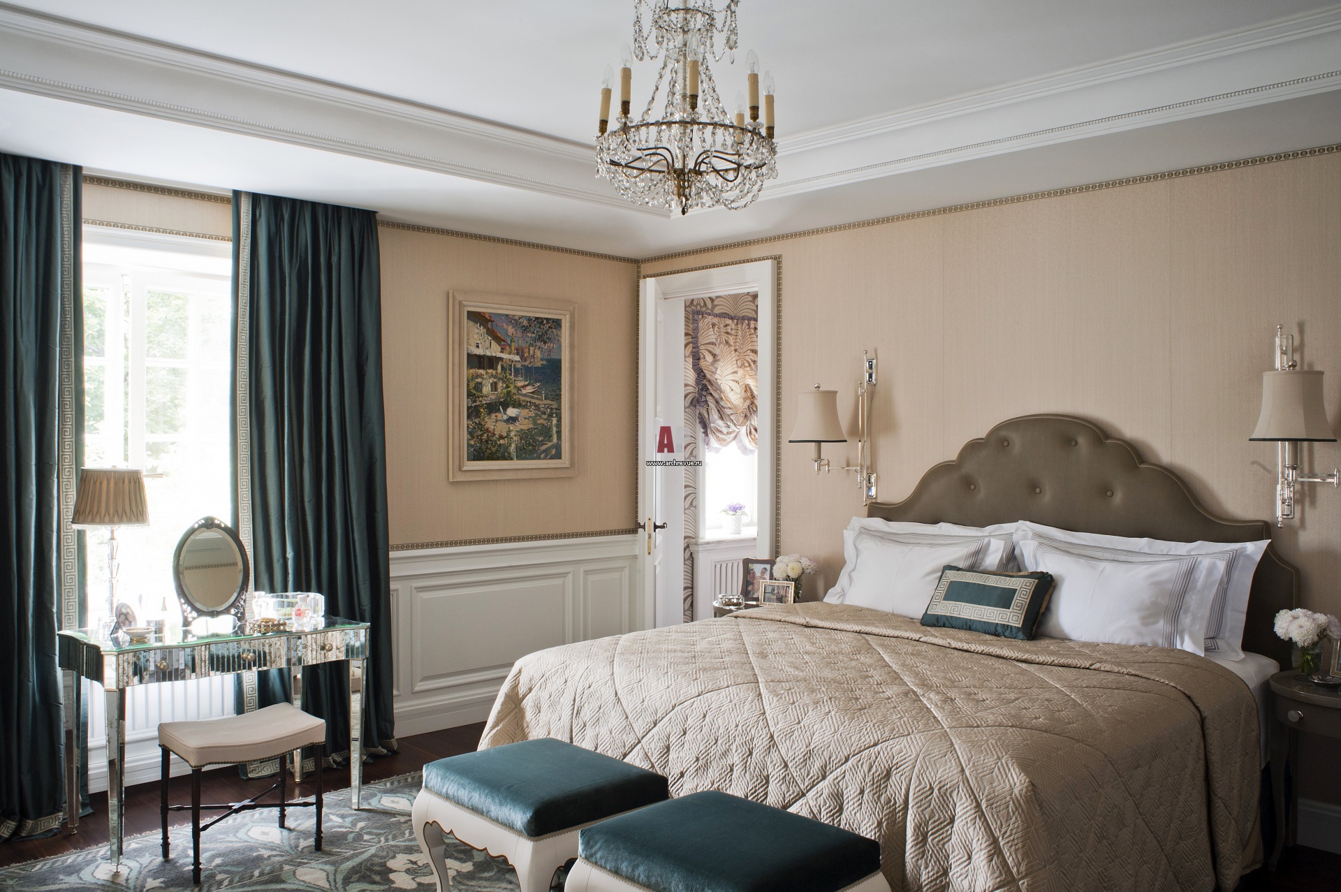 Интерьер спальни хозяев. Стены обтянуты тканью, Larsen. Ковер и кожаное изголовье кровати сделаны на заказ. Люстра, винтаж, Франция.