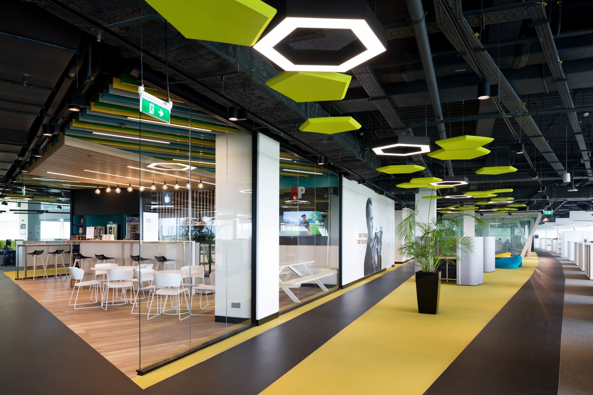 Офис компании Adidas Group. В оформлении интерьера использованы современные материалы: черный металл, фанера, наливные полы, граффити, стеклянные перегородки.