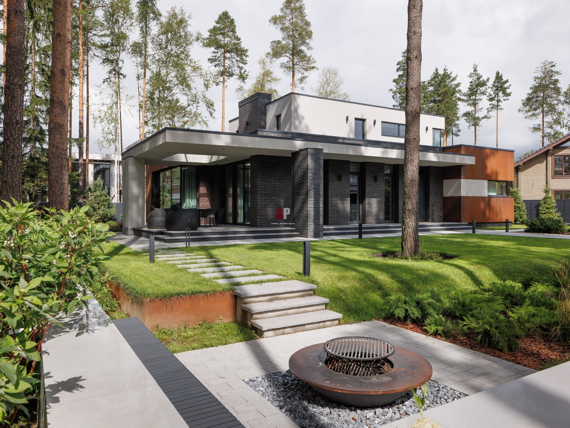 И на стыке между облагороженным садом и лесной зоной расположена костровая. Костровая чаша выполнена из черного металла, скамейка из бетона выглядит монументально. Подпорная стенка акцентирована кортеном, оформление ландшафта перекликается с архитектурой дома.