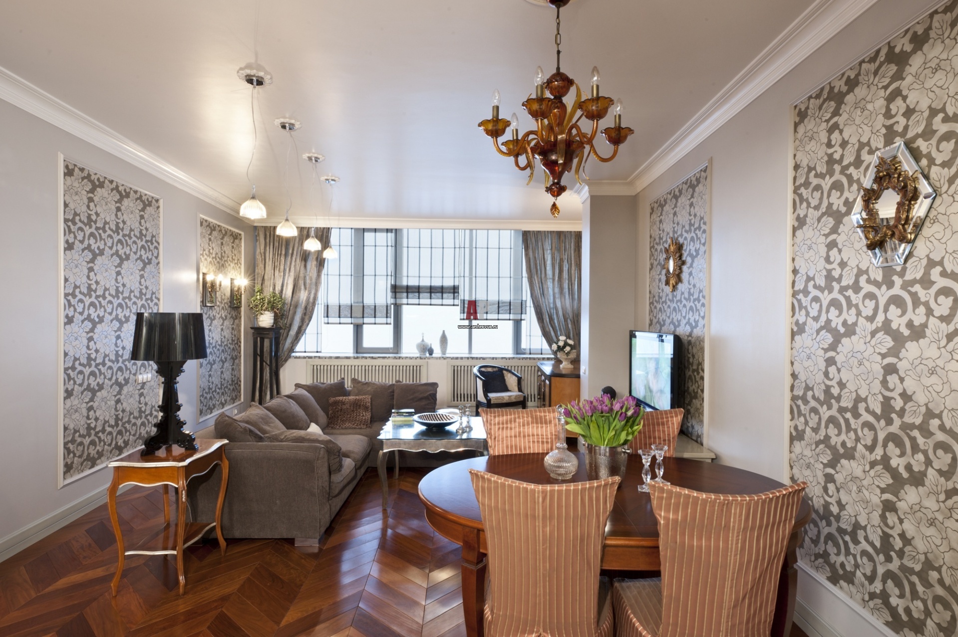 Интерьер гостиной с элементами ар-деко. Стены оформлены обоями Zoffany (коллекция Nureyev) с крупным цветочным орнаментом, обрамленными лепными молдингами. Диван, Roche Bobois. Комод, WonderWood.