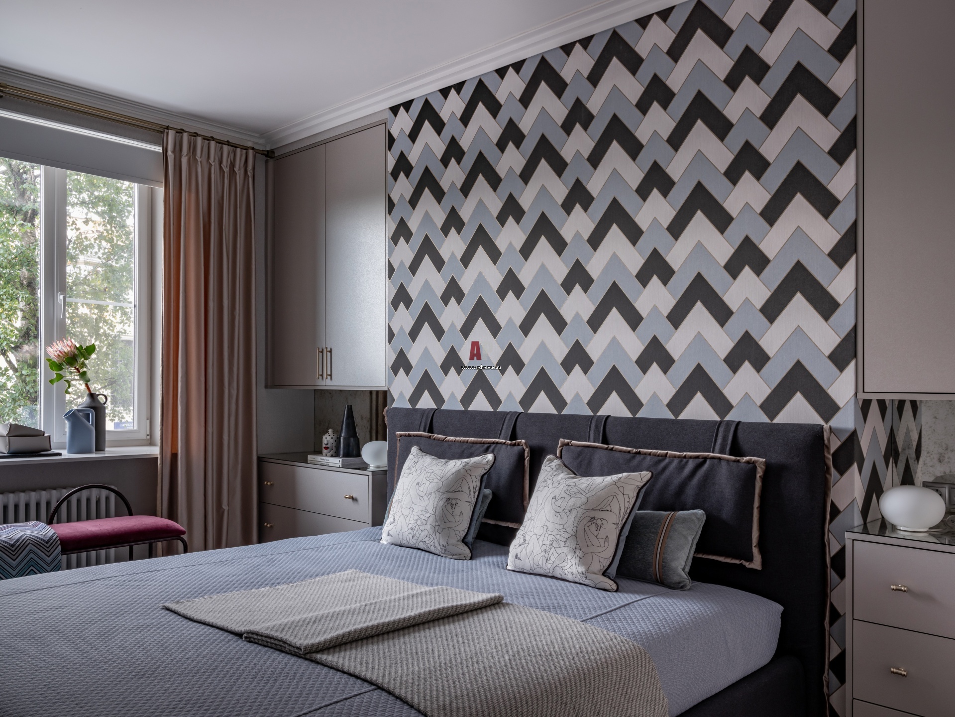 В навесном шкафу в нише слева от изголовья кровати спрятан кондиционер. Прикроватные тумбы и навесные шкафчики выполнены по индивидуальным эскизам из плиты Cleaf. Фурнитура, Salice Paolo в цвете «Шампань», поставщик EMPORIO.ru. Кровать, Felis. Скамья, AYTM.