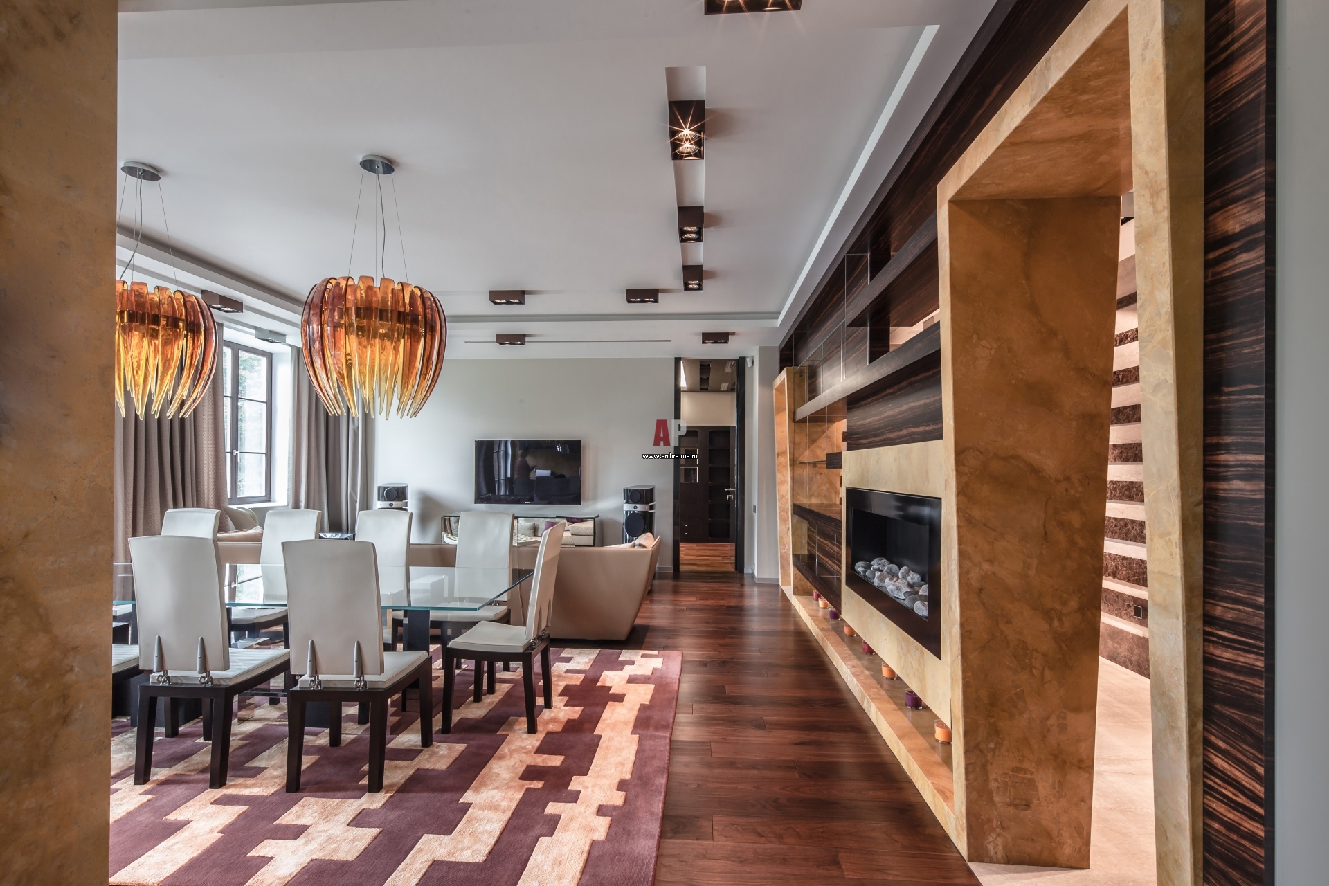 Гостиную от прихожей изолирует сложная архитектурная композиция из мрамора и эбенового дерева с динамичной пластикой. Работы по дереву, «АФ Ника».