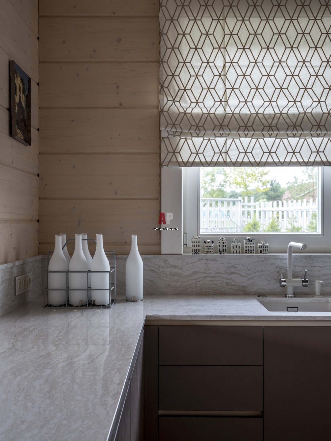 Двухэтажный дом из клееного бруса с современным дизайном. Интерьер кухни. Мойка и смеситель на кухне, Omokiri. Столешница – композитный камень.