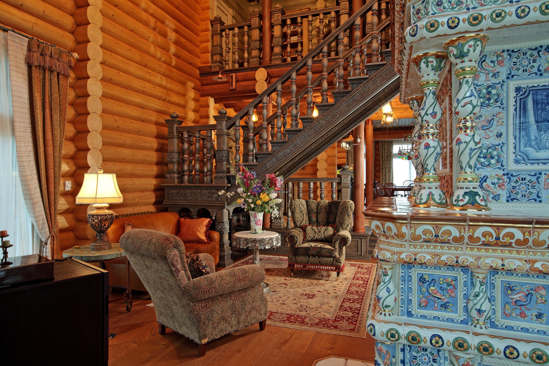 Четырехсторонний камин с открытой со всех сторон топкой облицован изразцами, основанным мотивом орнамента стала тема четырех времен года. С каждой из сторон изразцы имеют разный цвет и орнамент, что символично: на летней стороне преобладает зеленый цвет, на осенней – охра, в зимнем орнаменте много кобальта (синий), в весеннем – нежно-салатового. Цвета гармонично перетекают один в другой по плетеному орнаменту на углах сторон.