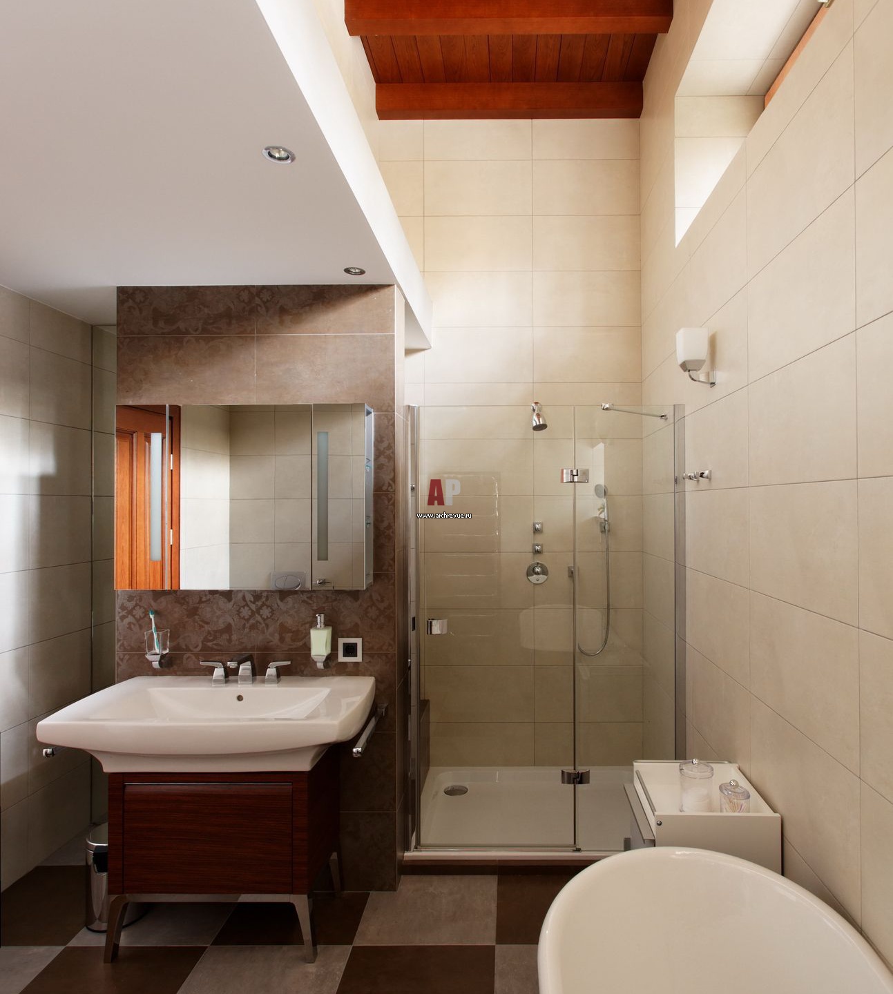 Благодаря разноуровневому потолку и зеркалам небольшой по размерам гостевой санузел на втором этаже визуально расширился. В нем появилась интрига и своя архитектурная стать.