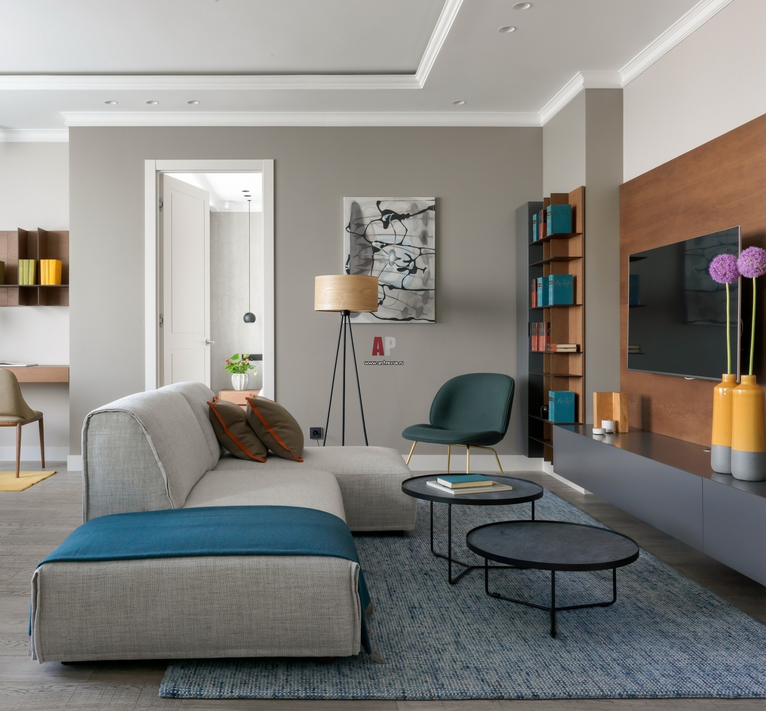 В основе эклектичного интерьера гостиной – лепнина, филенчатые двери, высокий плинтус – традиционные для американской классики элементы. В то же время наполнение вполне современное – минималистичная мебель, дощатый пол.