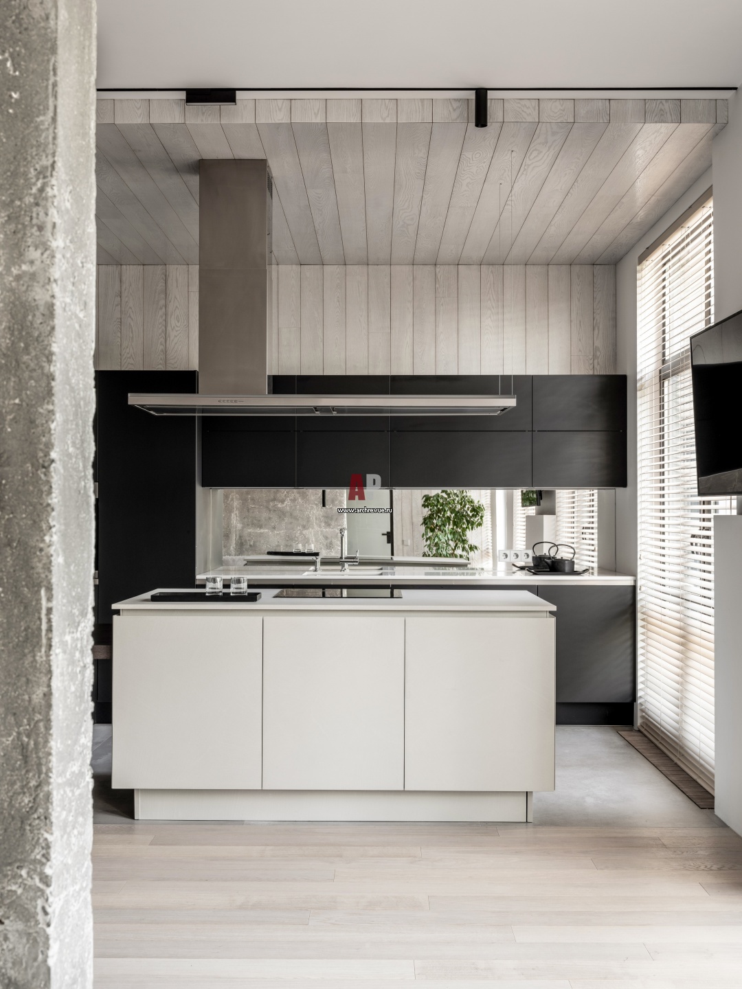 Потолок в зоне кухни частично отделан паркетной доской с графичной текстурой. Кухня с островом, Giulia Novars. Вытяжка, Falmec.