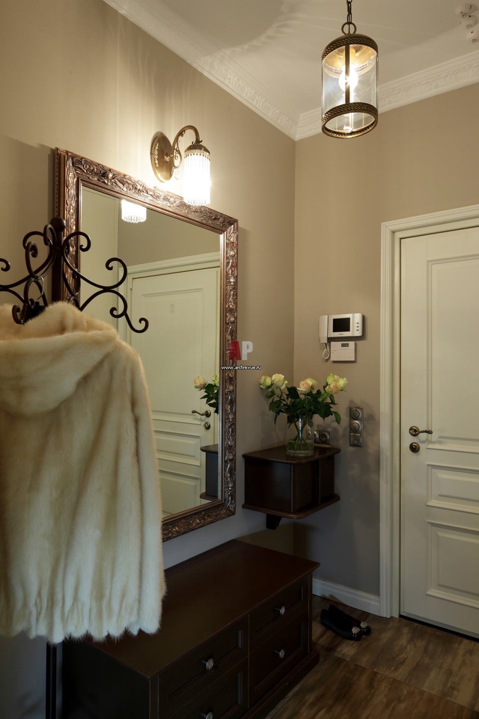 Небольшая прихожая. Лепной потолочный карниз с классическим узором, «Петергоф». Напольная плитка с эффектом ржавого металла.