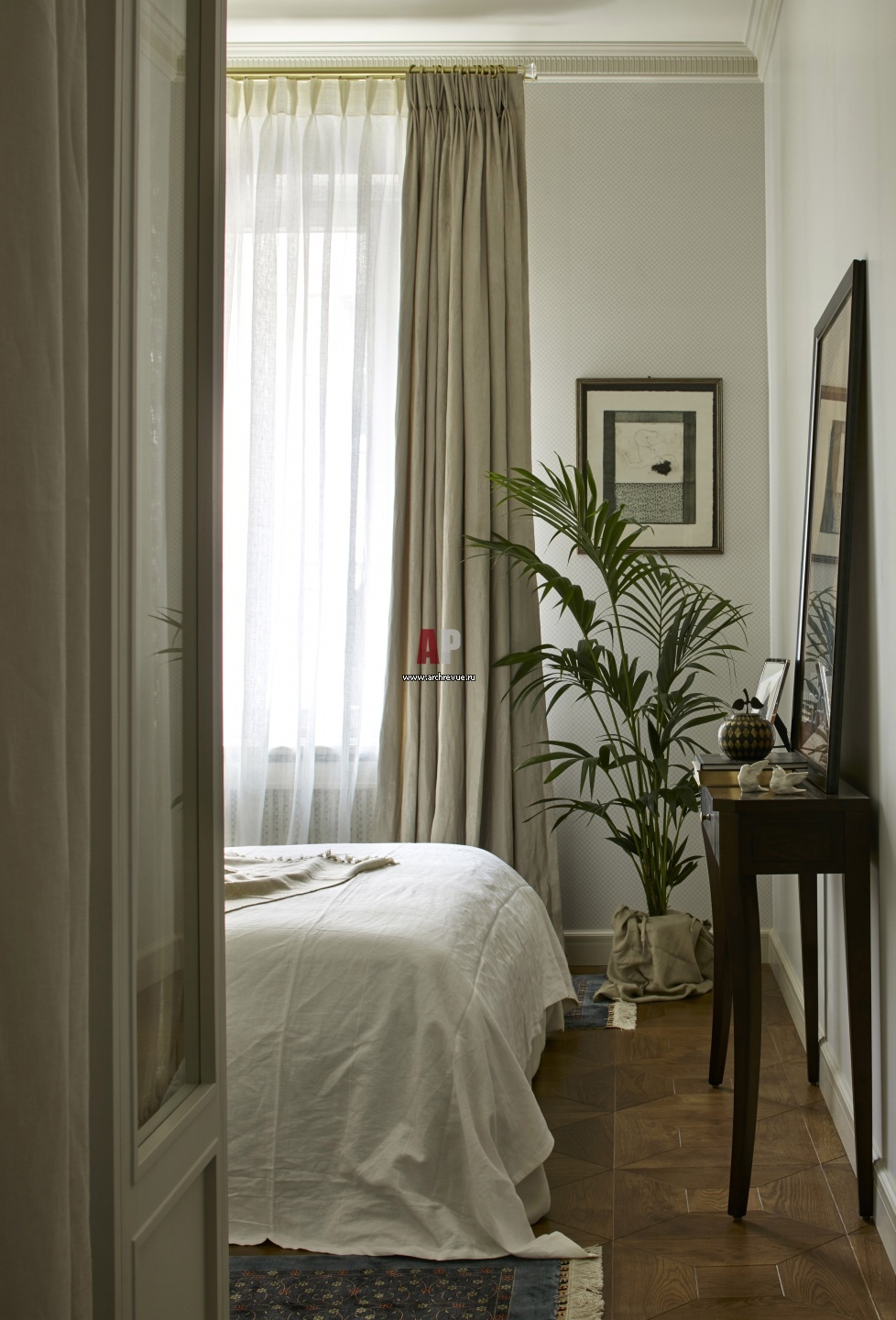 В текстильном оформлении интерьера предпочтение отдано светлым натуральным тканям с примесью льна.