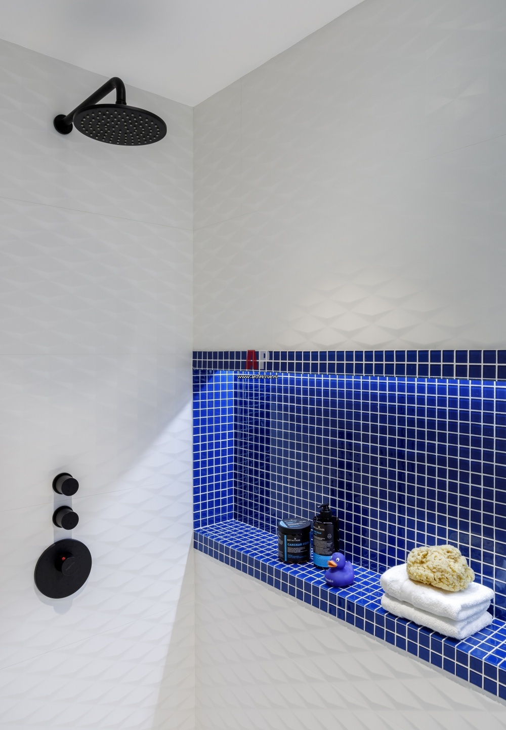 Душевая в детском санузле. Стены облицованы белой рельефной плиткой, Atlas Concorde. Ниша для душевых принадлежностей выделена синей мозаикой. Смесители, Fima Carlo Frattini.