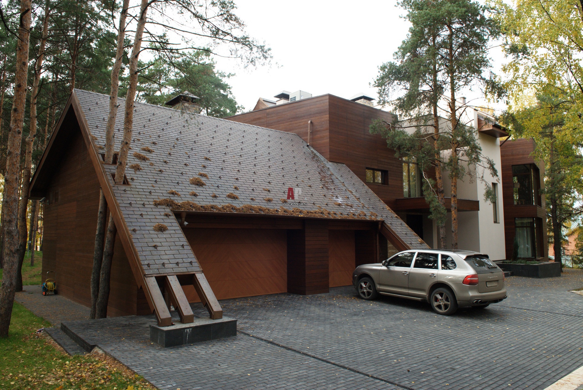 Главный фасад дома. Гараж накрывает скатная кровля, которая спускается почти до земли. Кровля крыта натуральной медью. Вместо тяжелых медных листов использовано покрытие Tegola. Оно представляет собой многослойный ковер, поверхность которого набрана из тонких медных пластин.